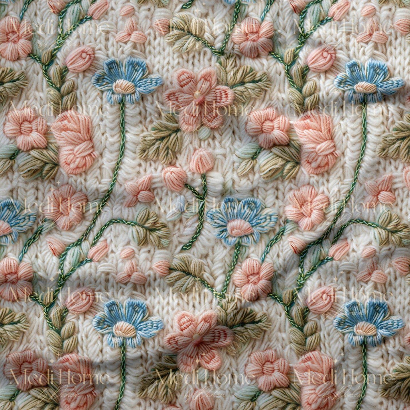 Krem tonlarındaki örgü dokulu zemin üzerine serpiştirilmiş pastel pembe tomurcuklar ve zarif mavi çiçekler, 3 boyutlu nakış efektli görünümüyle adeta el işçiliği hissi veriyor. Doğal yeşil yaprak detayları ve yumuşak renk geçişleri ile romantik ve huzurlu bir atmosfer yaratan bu desen, dekoratif projelere sıcak ve şık bir dokunuş katıyor.