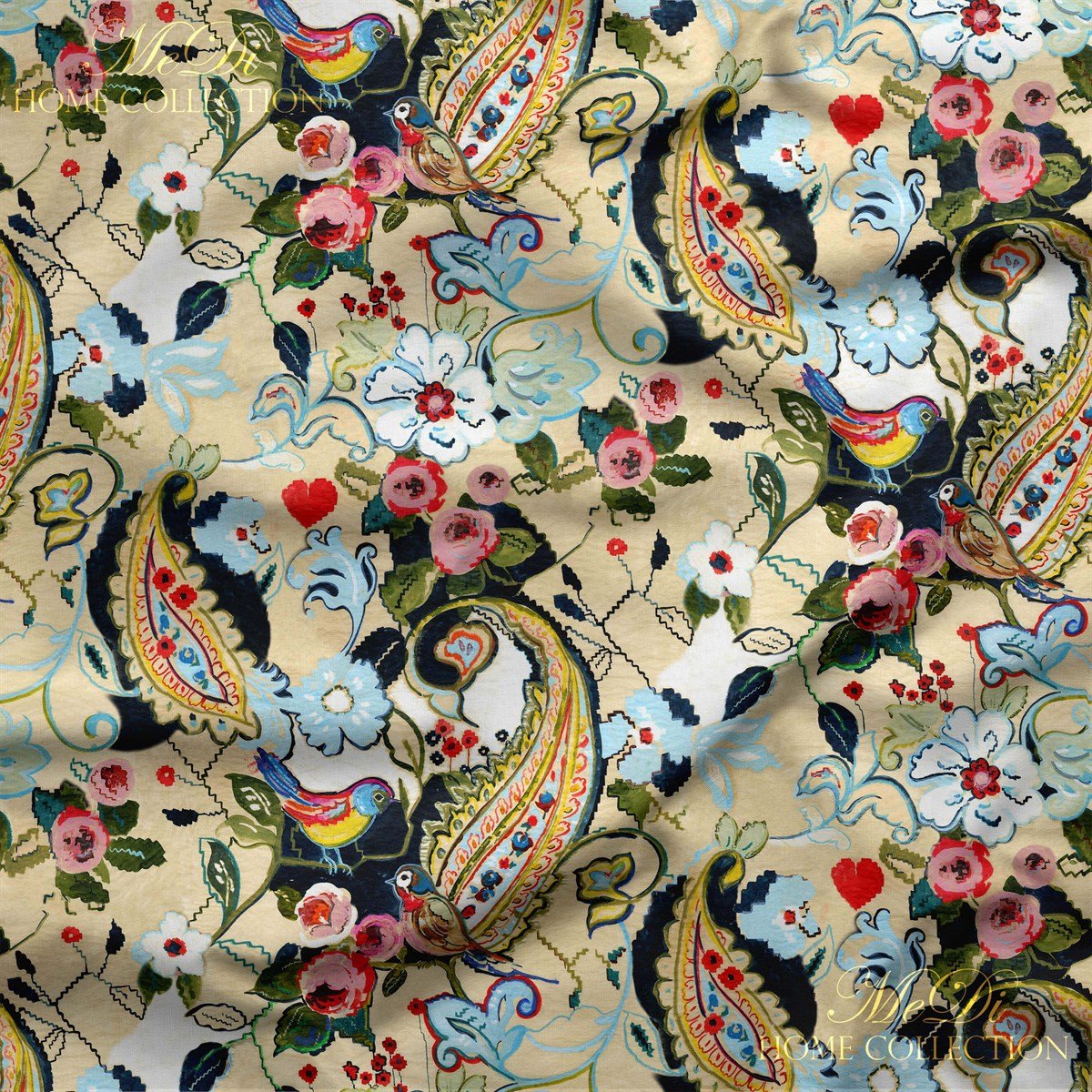 “Kuşlu Paisley Masalında Çiçek Rüyası” deseni, dijital baskı teknolojisiyle pastel tonlarda hazırlanmış; içinde kuşların melodisi, çiçeklerin naifliği ve paisley’lerin zarafeti gizli.