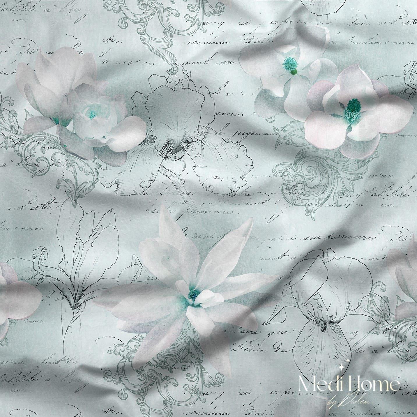 Açık mavi zemin üzerinde usul usul açan beyaz lilyum çiçekleri, desenin her köşesine zarafetini bırakıyor. Arka plandaki ince yazı dokuları ve barok esintiler desenin havasını romantik bir hikâyeye dönüştürüyor.  Hem modern hem klasik sevenler için tam bir stil köprüsü!