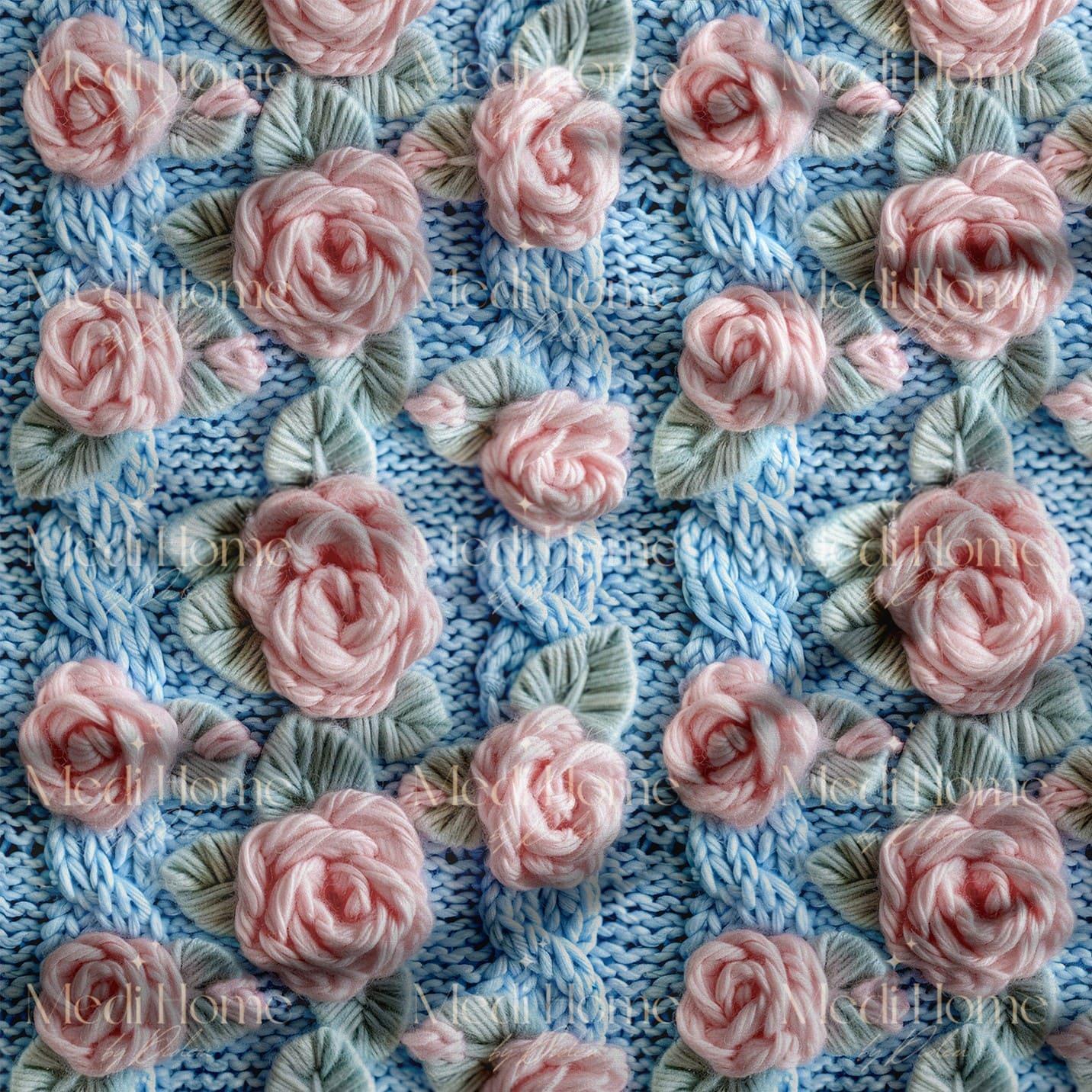 Mavi Örgü Üzerinde Pembe Güller Dijital Baskılı Kumaş (knitflor 1)