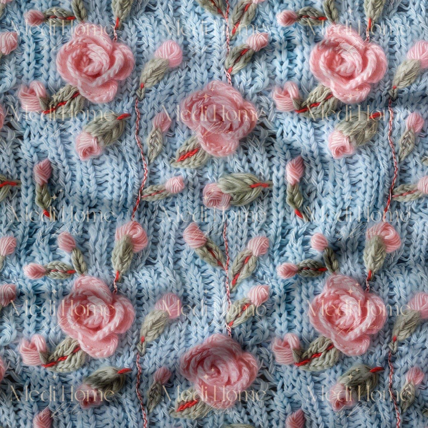 Mavi Örgüde Pudra Gül Baharı Dijital Baskılı Kumaş (knitflor 2)