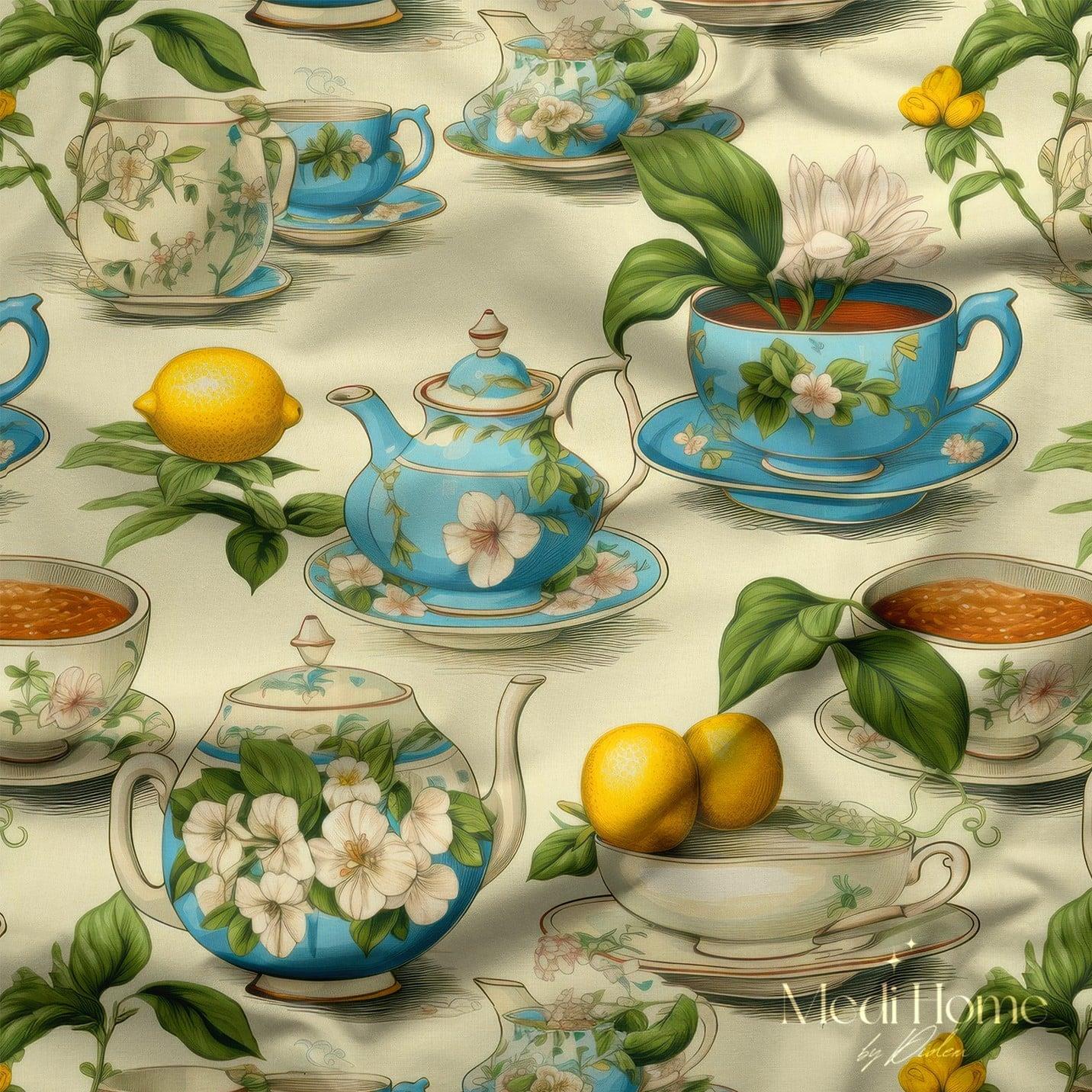 Romantik bir bahar öğleden sonrası hayal et: zarif mavi-beyaz porselen fincanlar, çaydanlıklar, taze limonlar ve çiçeklerle süslü tabaklar. Bu desen, nostaljik zarafetin tam karşılığı. Yumuşak bej zemin üzerine işlenen vintage çay takımı illüstrasyonları, modern-retro sevenler için harika bir seçenek.