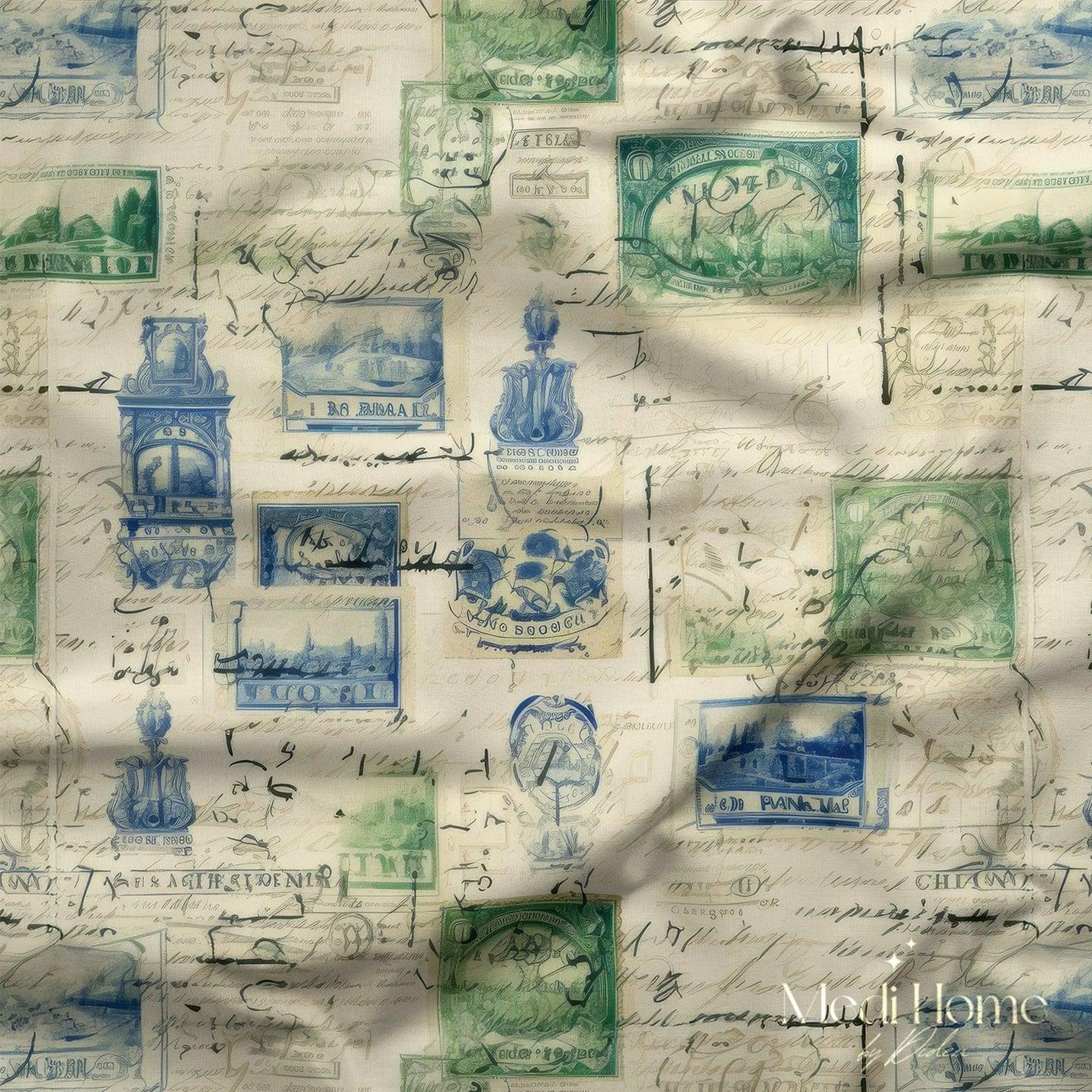 Mektup Pullarının Nostaljik Yolculuğu Dijital Baskılı Kumaş (MB-0173)