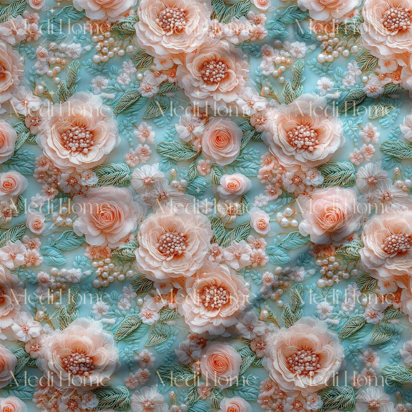 Turkuazın ferahlığıyla buluşan mercan ve şampanya tonlarındaki güller, 3 boyutlu nakış efektli görünümleriyle kumaşın üzerinde adeta canlanıyor. İnci taneleri ve zarif yaprak detayları, bu desene romantik ve lüks bir dokunuş katıyor.