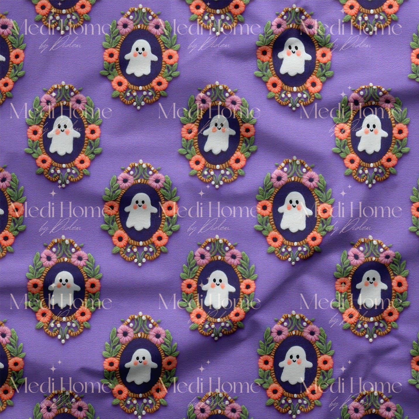 Mor Bahçedeki Çerçeveli Sevimli Hayaletler Dijital Baskılı Kumaş