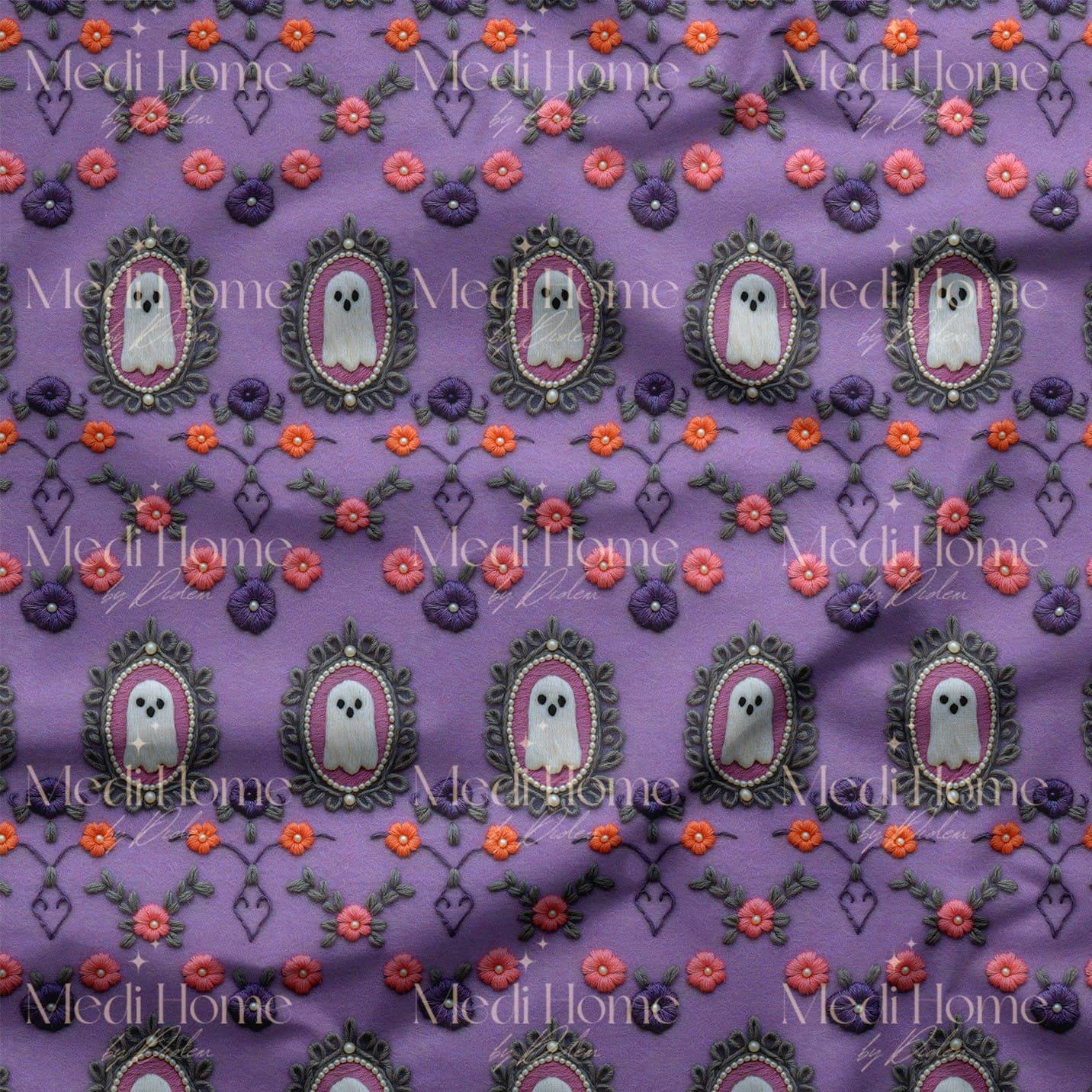 Lavanta tonlarındaki zemin üzerinde çerçeveler içine yerleşen sevimli beyaz hayaletler, etraflarını saran kırmızı ve mor çiçeklerle zarif bir kontrast oluşturuyor. 3 boyutlu nakış efektli detaylar, kumaşa hem masalsı hem de şık bir doku kazandırıyor.