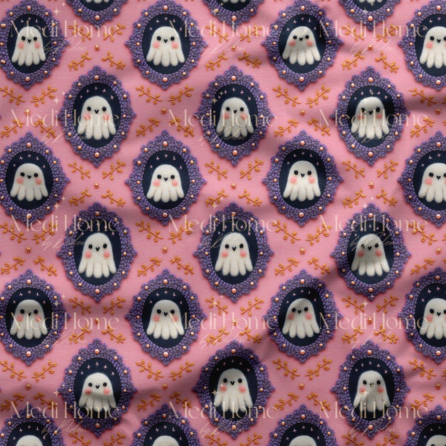 Yumuşak pembe zemin üzerine yerleştirilmiş mor çerçeveler içinde sevimli beyaz hayaletler, altın tonlu minik süs detaylarıyla birleşerek masalsı bir hava yaratıyor. 3 boyutlu nakış efekti sayesinde derinlikli ve göz alıcı bir görünüm sunuyor.