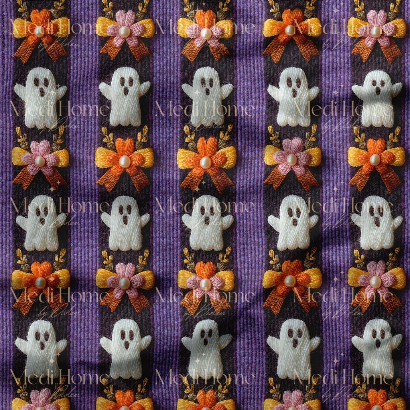 Derin mor şeritler üzerine yerleştirilmiş sevimli beyaz hayaletler, turuncu ve pembe tonlardaki 3 boyutlu kurdelelerle buluşuyor. Sonbaharın enerjisini yansıtan canlı renk paleti, bu kumaşa hem eğlenceli hem de zarif bir Halloween dokusu kazandırıyor.