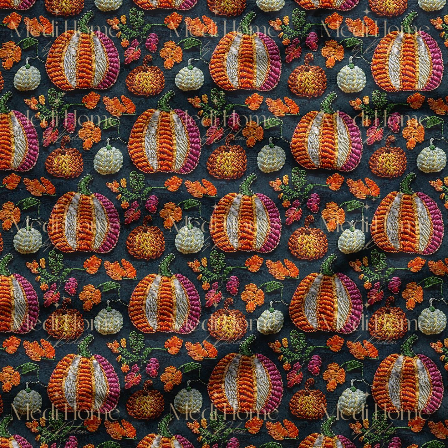 Mor & Turuncu Işıltısıyla Balkabağı Bahçesi Dijital Baskılı Kumaş (Embroidered Pumpkins Plaids-25)