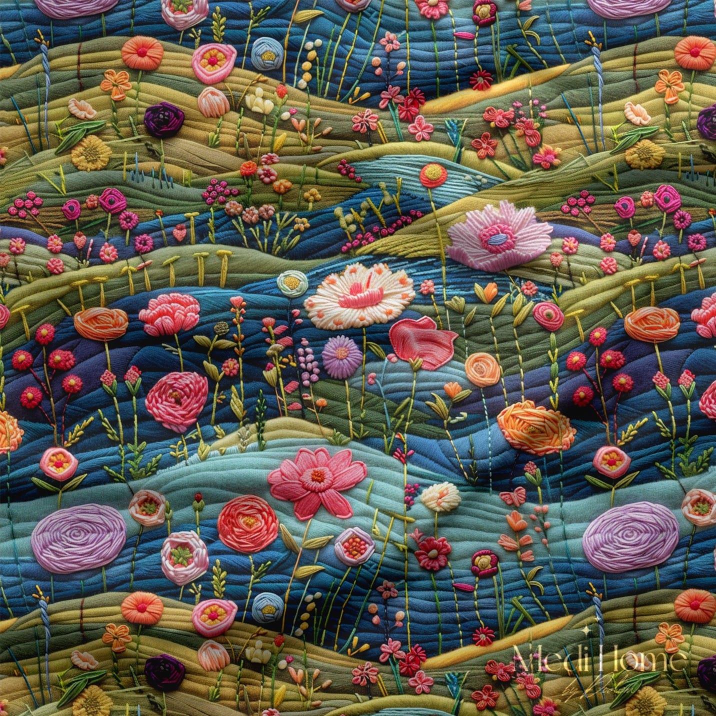 Yeşil ve mavi dalgalar şeklinde kıvrılan tepelerin üzerinde, el nakışı gibi işlenmiş rengârenk çiçekler. Pembe, fuşya, lila, sarı, krem ve mercan tonlarındaki çiçekler, adeta baharın neşesini kumaşa taşımış. Her detay, üç boyutlu nakış görünümü sayesinde sanki dokununca hissedilecekmiş gibi gerçekçi.
