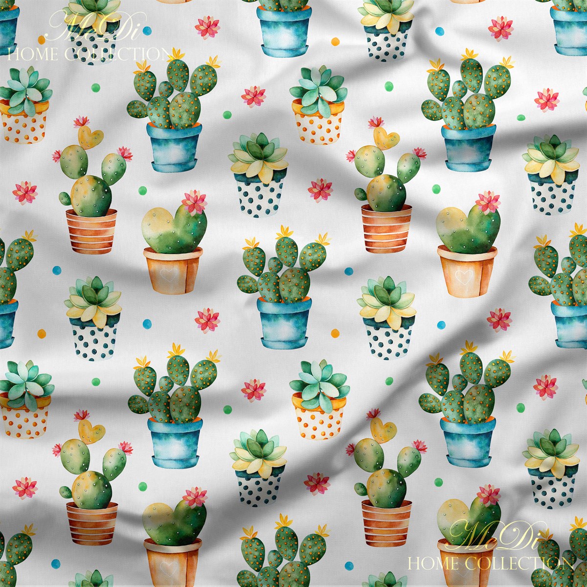 Beyaz zemin üzerine yerleşmiş rengarenk saksılarda kaktüsler, sukulentler ve minik çiçek detaylarıyla dolu bu desen; içinizi ısıtan, yüzünüzü güldüren bir pozitiflik taşıyor. Pastel renkli noktalar, desenin eğlenceli yapısını destekliyor.