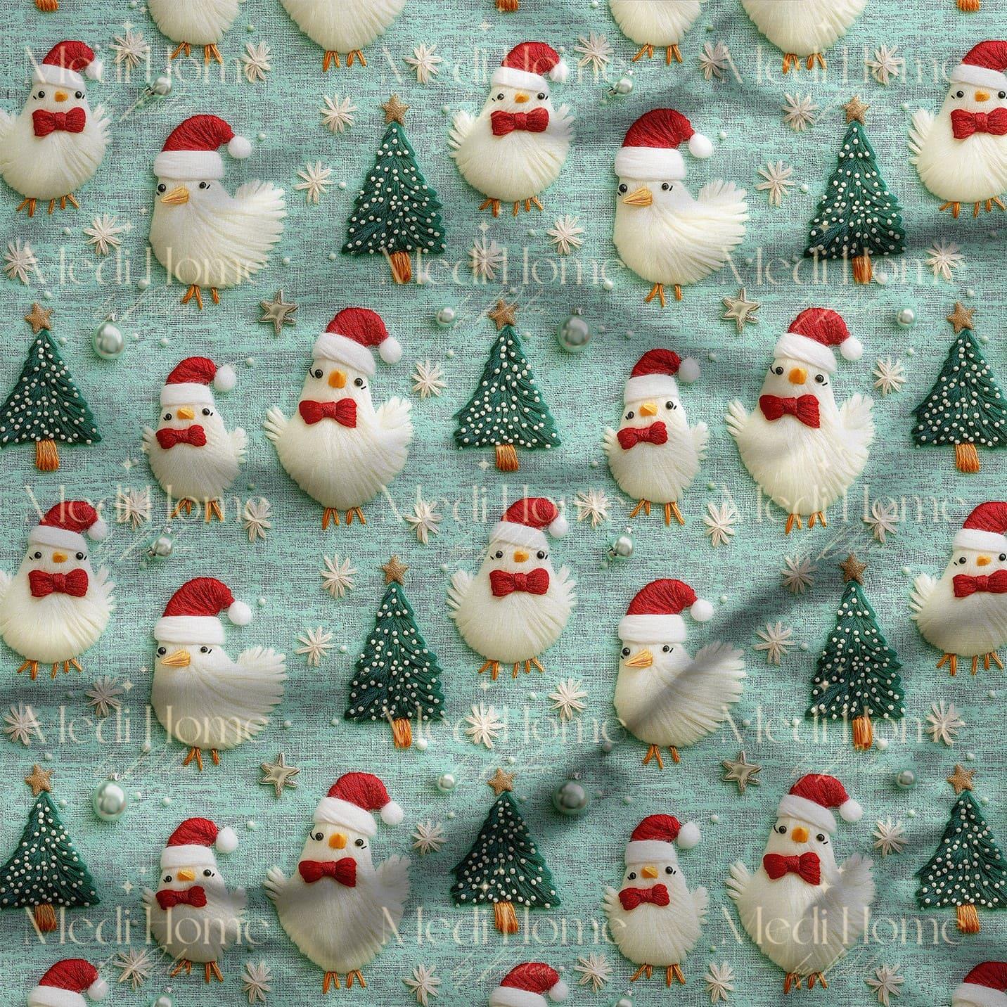 Neşeli yılbaşı ruhunu masalsı bir dille taşıyan bu desen, tavukların eğlenceli karakterini kış dekorasyonlarına getiriyor. Noel şapkaları ve kırmızı papyonlarıyla süslenen sevimli tavuklar, yanlarında ışıl ışıl yılbaşı çamları ve kar taneleriyle buluşuyor. Nakış efektli 3 boyutlu baskı sayesinde tavukların tüy dokuları, şapkaların pofuduk detayları ve çam ağaçlarının incelikli desenleri kumaşın üzerinden çıkacakmış gibi canlı ve derin görünüyor.