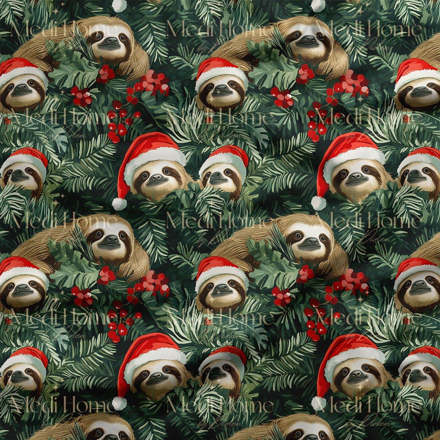 Sevimli tembel hayvanlar, Noel şapkalarıyla yılbaşı ağacının dalları arasında gizlenmiş gibi görünüyor. Çam dallarının yeşil dokusu, kırmızı çobanpüskülü meyveleri ve minik detaylarla birleşerek desenin eğlenceli ama aynı zamanda şık bir havası var. Dijital baskının canlı tonlarıyla birleşerek sofralarınıza, kırlentlerinize ya da dekoratif projelerinize sıcacık bir yılbaşı ruhu taşıyor.