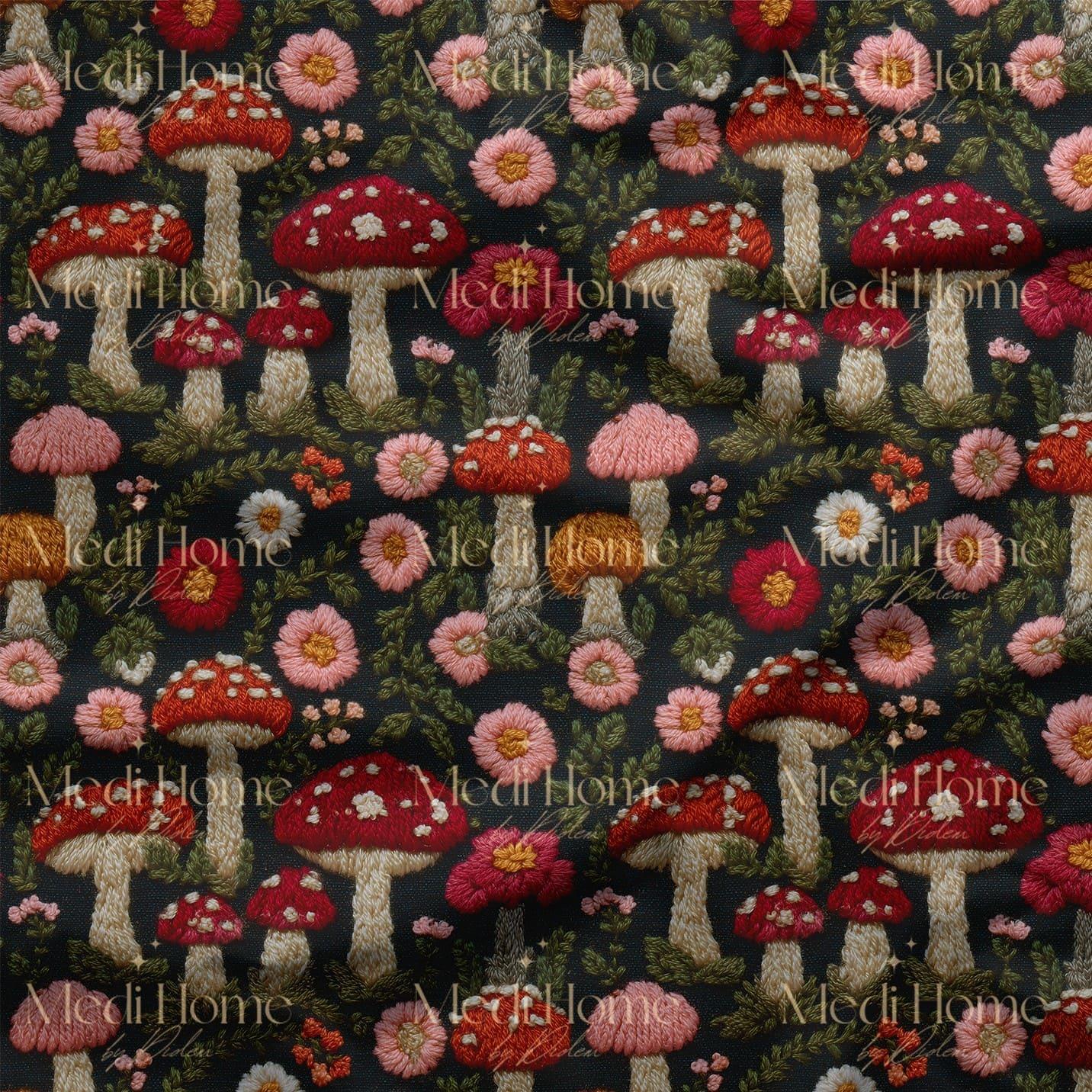 “Orman Masalında Mantarlar”, doğanın büyülü atmosferini 3 boyutlu doku hissiyle buluşturan benzersiz bir tasarım. Siyah zemin üzerinde yükselen kırmızı beyaz mantarlar, pembenin ve yeşilin yumuşak tonlarındaki çiçeklerle birleşerek masalsı bir orman sahnesi yaratıyor. Her bir mantar detayı, 3 boyutlu efektlerle adeta kumaşın üzerinden ışıkla dokunmuş gibi parlıyor.
