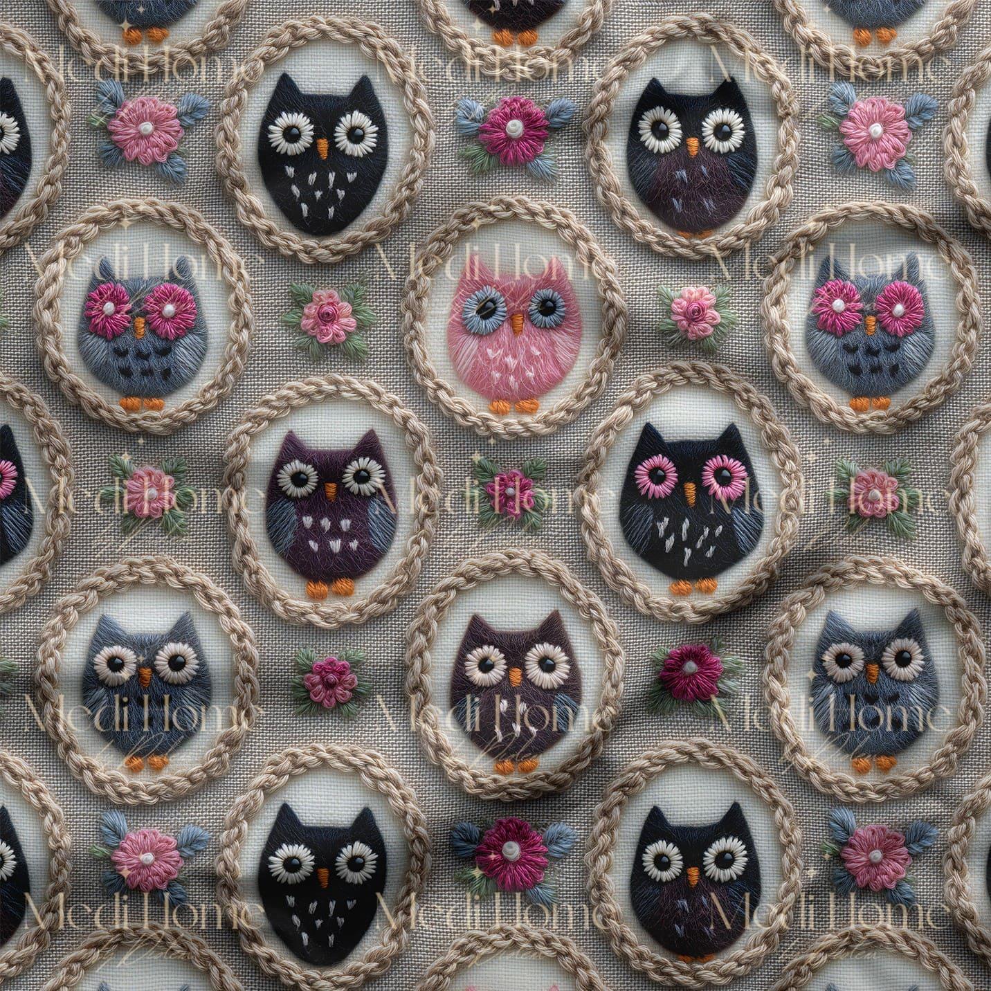 Doğal keten görünümlü arka plan üzerinde, pastel ve canlı renklerde tasarlanmış baykuşlar el yapımı gibi nakış efektli 3 boyutlu bir şıklıkla öne çıkıyor. Pembe, mor, lacivert ve gri tonlarındaki sevimli baykuşlar örgü ipi hissi veren çerçeveler içinde yer alıyor. Her detayı el emeğini andıran bu kumaş, dekoratif projelerinize sıcak ve doğal bir hava katıyor.