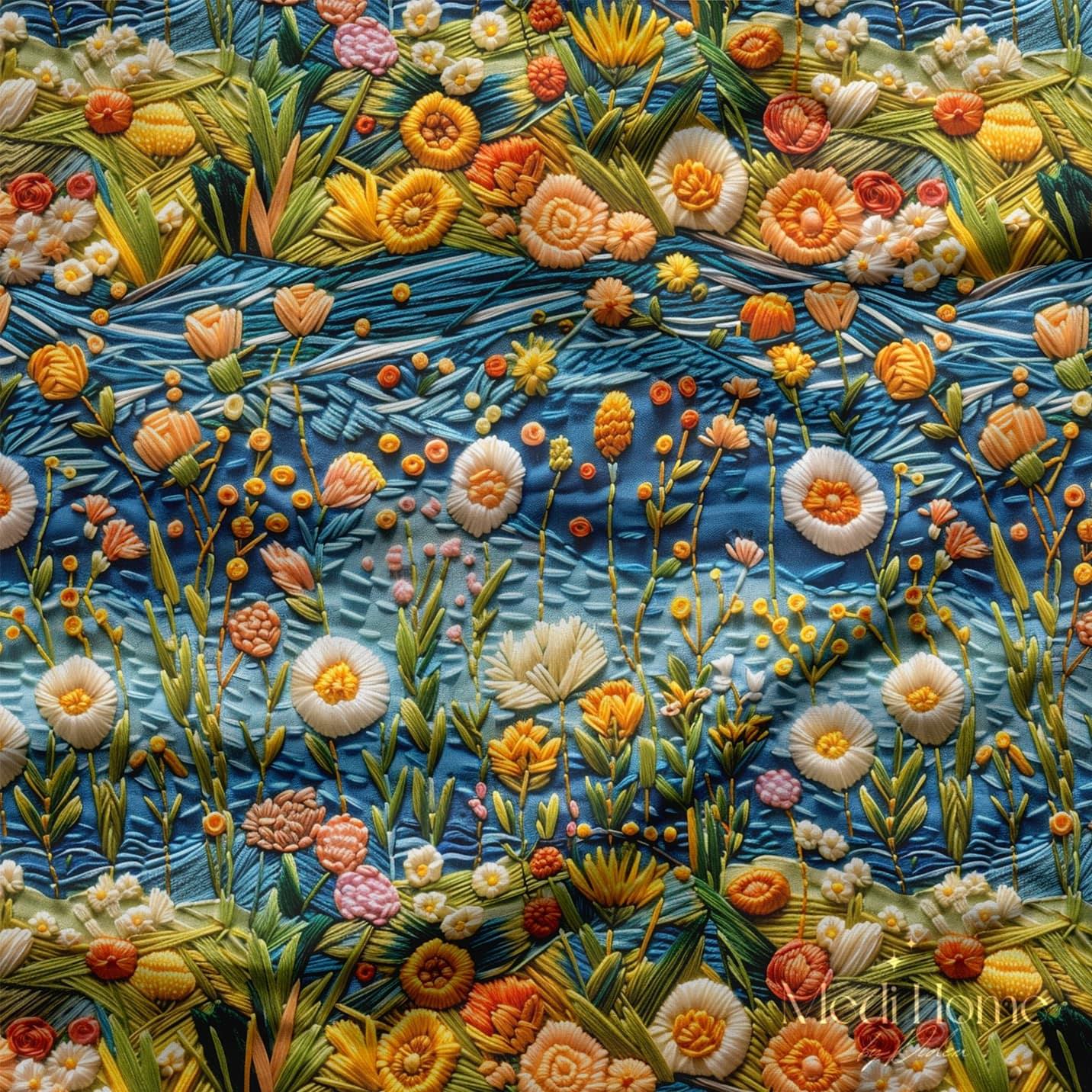 Tatlı pastel tonlarının en zarif haliyle buluştuğu bu desen, tıpkı bir el nakışı gibi görünen üç boyutlu çiçek detaylarıyla bezeli. Maviye çalan yumuşak fonda, sarıdan pembeye, lila ve lavanta tonlarına kadar sayısız çiçek motifi bir araya geliyor.