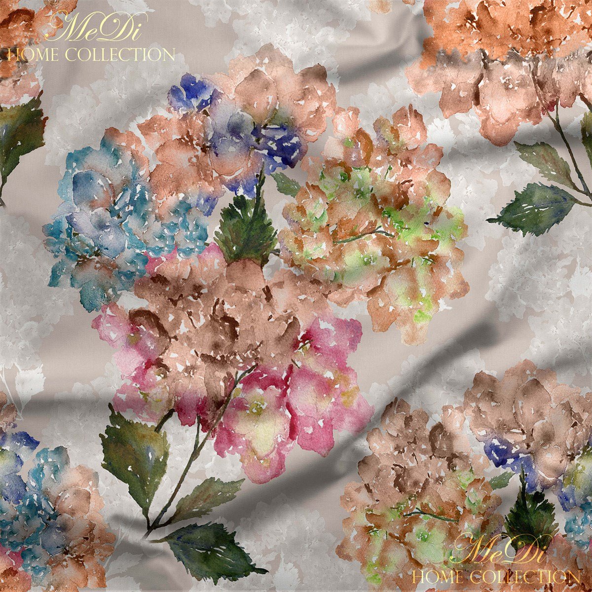 Sanki bir suluboya tablosundan fırlamış gibi. Mavi, somon, lila ve yeşil pastel tonlarda çiçek açmış ortancalar; zarif bir şekilde açık dokulu zemin üzerine serpiştirilmiş. Fon perde, yastık, masa örtüsü ya da zarif koltuklar için kullanıldığında ortamın ruhunu hafifletir ve huzurla doldurur.