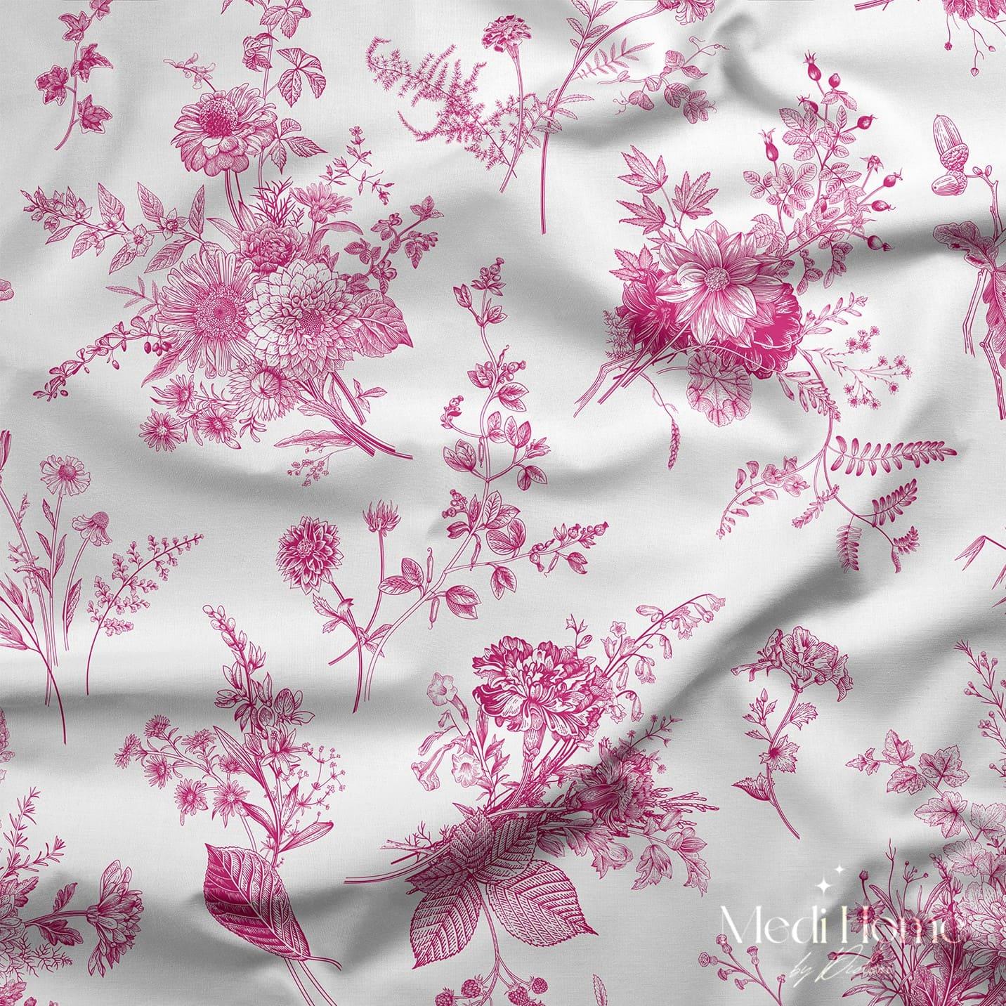 “Pembe Baharın El Yazması”, sanki eski bir botanik defterinden alınmış çizimlerle dolu, zarif ve romantik bir desen. Beyaz zemin üzerine pembe tonlarında hazırlanmış çiçek illüstrasyonları; ortancalar, karanfiller, papatyalar ve incecik dallarla dans eden yapraklar eşliğinde, ilkbaharın duygusal notalarını taşıyor.