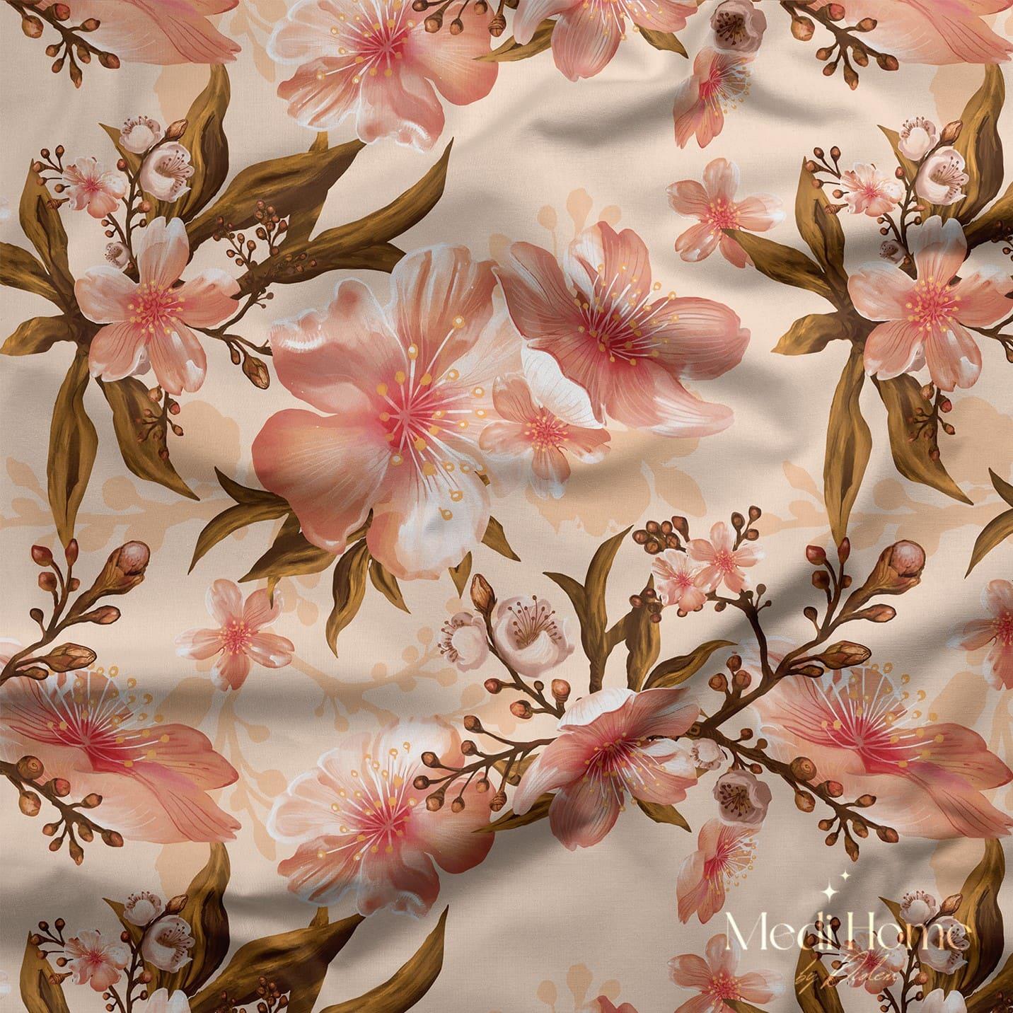 Baharın gelişini müjdeleyen narin pembe çiçekler, kahverengi dallar ve yeşilimsi yapraklarla birleşerek huzurlu bir tablo oluşturuyor. “Pembe Baharın Zarif Dalları” deseni, romantik ve doğal bir görünüm arayanlar için tasarlandı. Açık krem zemin, desenin tüm renklerini zarif bir şekilde öne çıkarıyor.