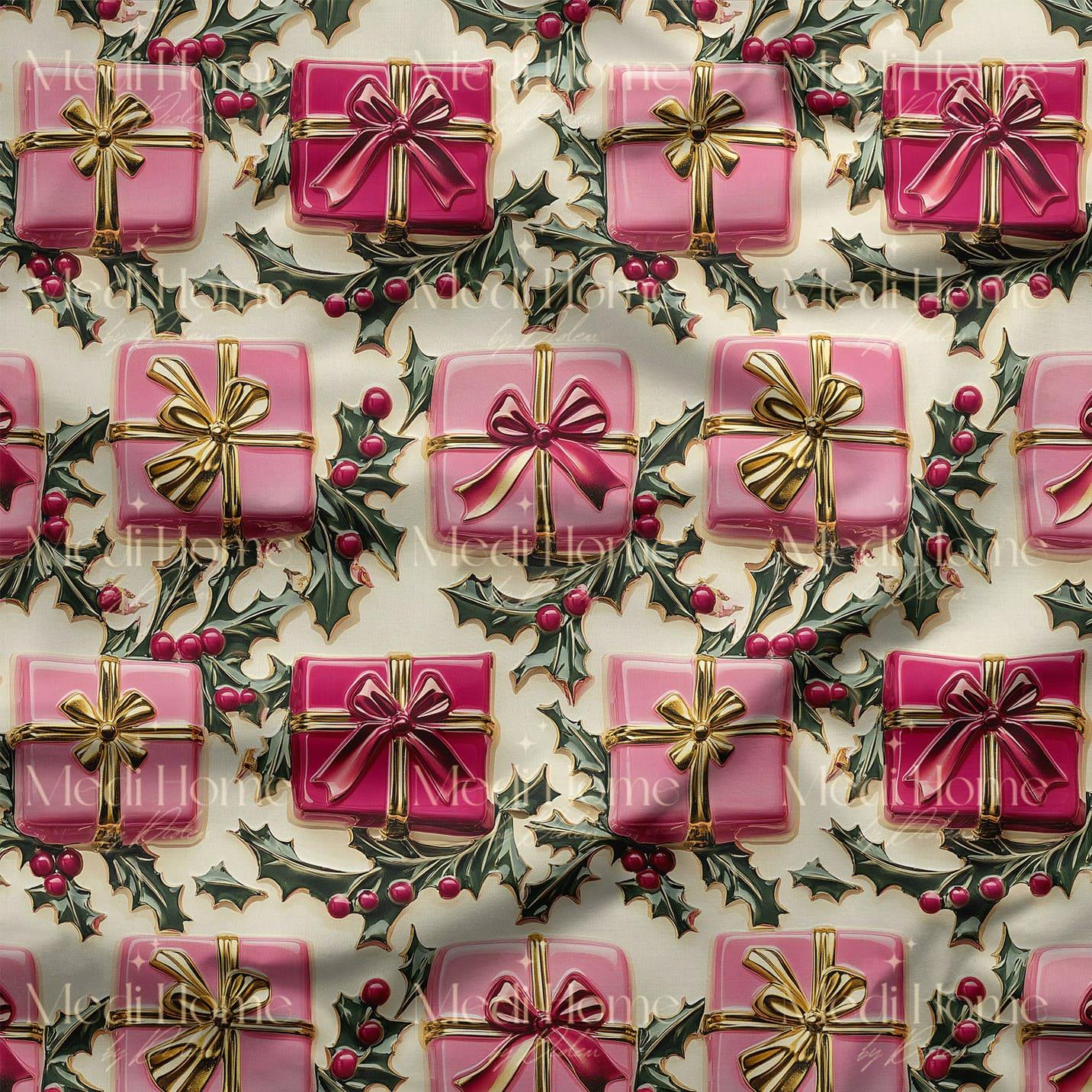 Altın kurdelelerle süslenmiş pembe hediye kutuları, parlak yapraklı çobanpüskülleri ve kırmızı meyvelerle birleşerek yılbaşı ruhunu sıcacık bir şekilde yansıtıyor. Enerjik pembe tonları klasik yılbaşı renklerine modern bir dokunuş katarken, desenin göz alıcı canlılığı ev dekorasyonunuza neşe ve ışıltı getiriyor. Dijital baskının pürüzsüz renkleriyle birleşerek şık ve özel projeleriniz için kusursuz bir seçim sunuyor.