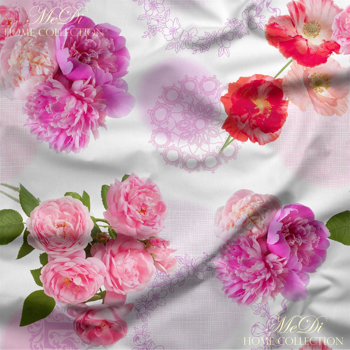 Beyaz ve açık pembe tonlarında yumuşak bir fon üzerinde, mor, pembe ve kırmızının en romantik tonlarıyla işlenmiş iri çiçekler. Zarif dantel motifleriyle süslenen arka plan, desene nostaljik bir zarafet katıyor. Gül, şakayık ve gelinciklerin zarif uyumu, adeta baharın en özel köşesinden koparılıp kumaşa taşınmış gibi.