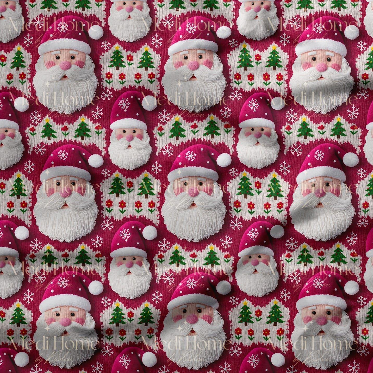 “Pembe Noel Baba Masalı”, pembe tonlarında hazırlanmış 3 boyutlu kabartma efektli özel bir yılbaşı kumaşıdır. Kumaşın üzerinde yer alan sevimli Noel Baba yüzleri, beyaz sakal dokusu ve ponpon detaylarıyla gerçek örgü hissi verir. Arka planda pembe-beyaz örgü desenli zemin, minik yeşil çam ağaçları ve kar taneleriyle birleşerek sıcacık bir atmosfer oluşturur.
