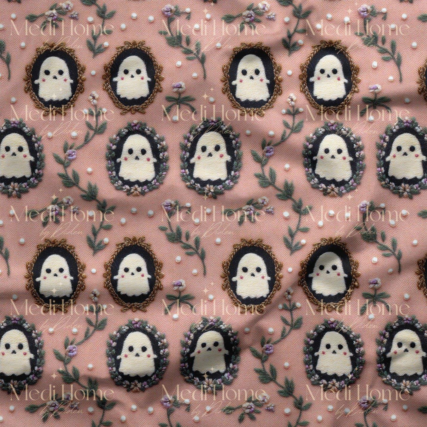 Pudra pembesi zemin üzerinde incelikle çerçevelenmiş sevimli beyaz hayaletler, minik mor ve lila çiçeklerle süslenmiş zarif bir kompozisyon sunuyor. 3 boyutlu nakış efektiyle kabartmalı görünüm kazanan bu dijital baskılı kumaş, romantik ve masalsı bir atmosfer yaratmak için mükemmel bir seçim