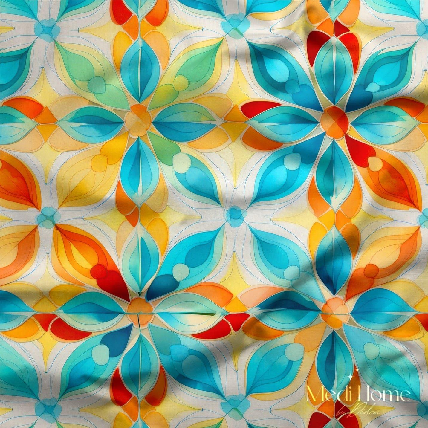 Turkuaz, sarı, kırmızı ve turuncunun buluştuğu bu çiçeksi geometrik desen, adeta yaz güneşiyle parlayan cam vitrayları andırıyor. İç içe geçmiş yaprak formları, düzenli ama bir o kadar da enerjik bir ritim oluşturuyor. Hem modern hem nostaljik hisleri bir arada taşıyan bu tasarım, mekanlara ışık gibi düşecek.