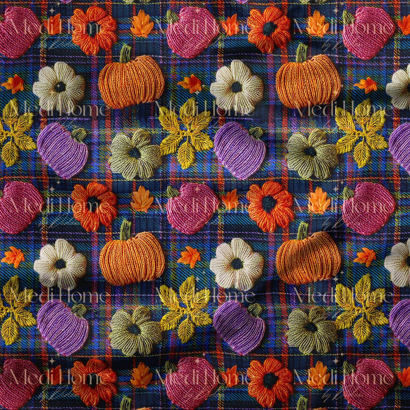 Renk Cümbüşünde Balkabağı Şenliği Dijital Baskılı Kumaş (Embroidered Pumpkins Plaids-09)