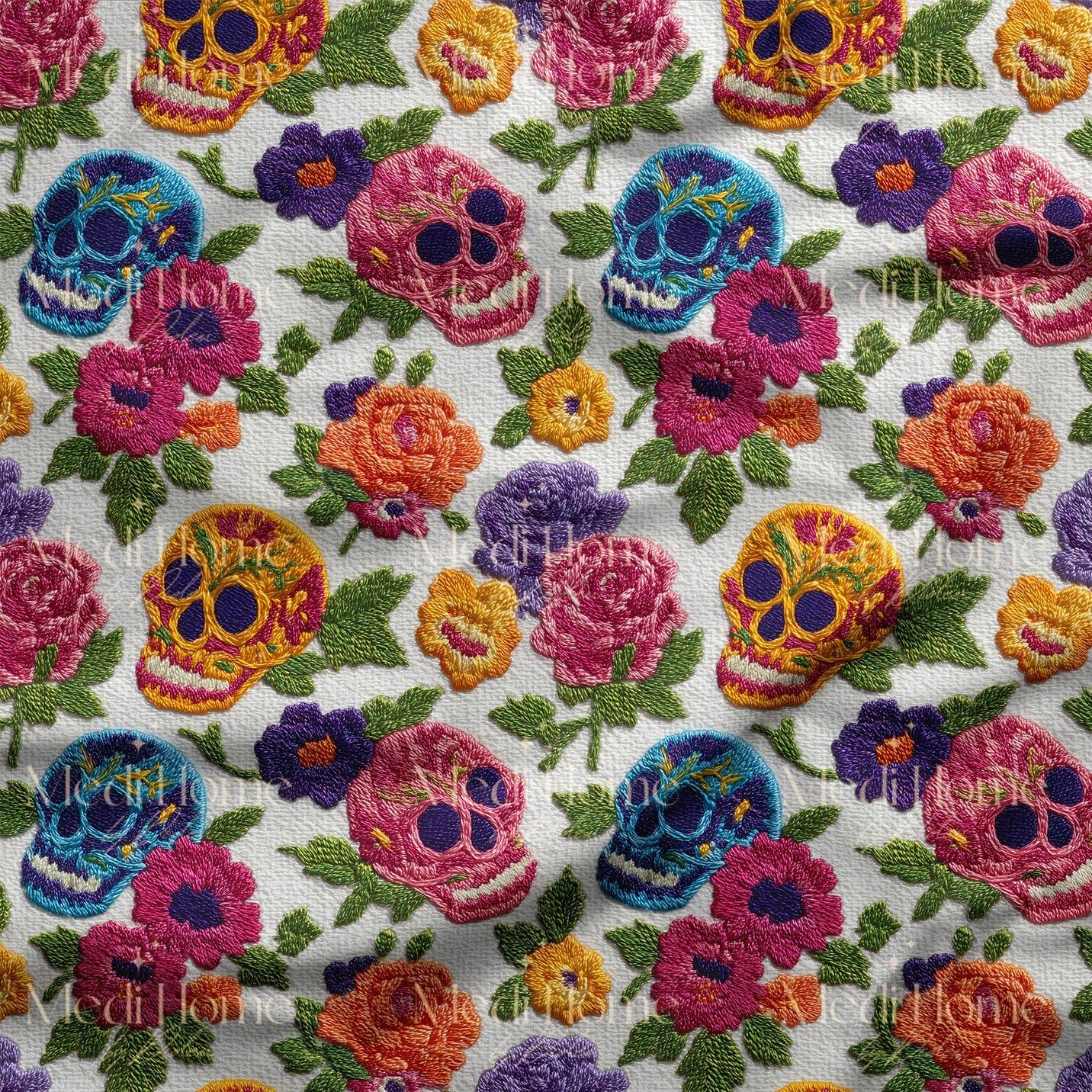 Canlı pembe, turuncu, mor, sarı ve mavi tonlarındaki çiçeklerle süslenmiş kafatasları, Latin kültürünün coşkusunu ve sanatsal enerjisini yansıtan büyüleyici bir tasarım oluşturuyor. Beyaz zemin üzerinde nakış efektli 3 boyutlu görünümüyle dikkat çeken bu desen, Day of the Dead (Ölüler Günü) temalı neşeli bir atmosferi yaşam alanlarınıza taşıyor.