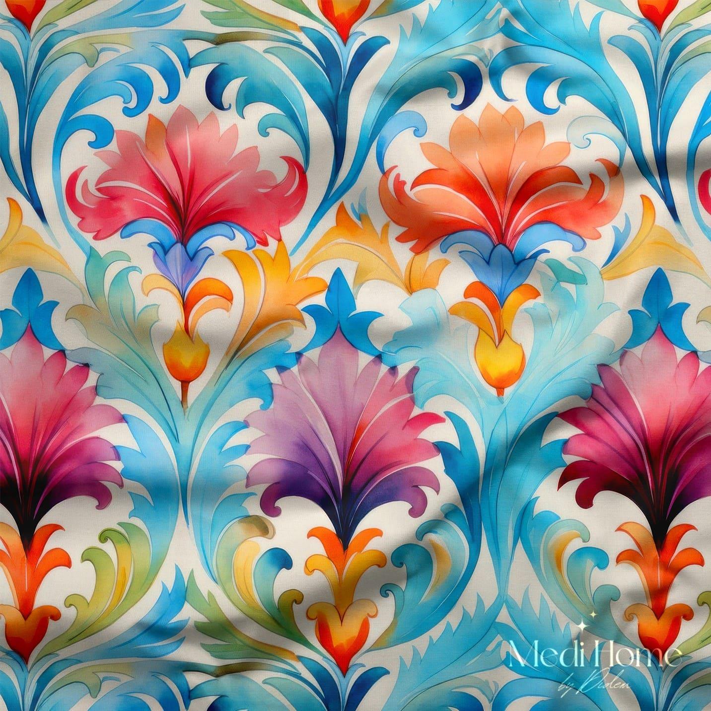 Tarihi barok desenlerin modern yorumuyla buluştuğu bu desen, adeta bir renk senfonisi. Parlak fuşya, turuncu, mavi, sarı ve mor tonlar; zarif kıvrımlarla dans ederken desenin her köşesine neşe ve ihtişam yayıyor. Kumaş üzerindeki hareketli formlar, klasik zarafetin enerjik bir yorumunu sunuyor.