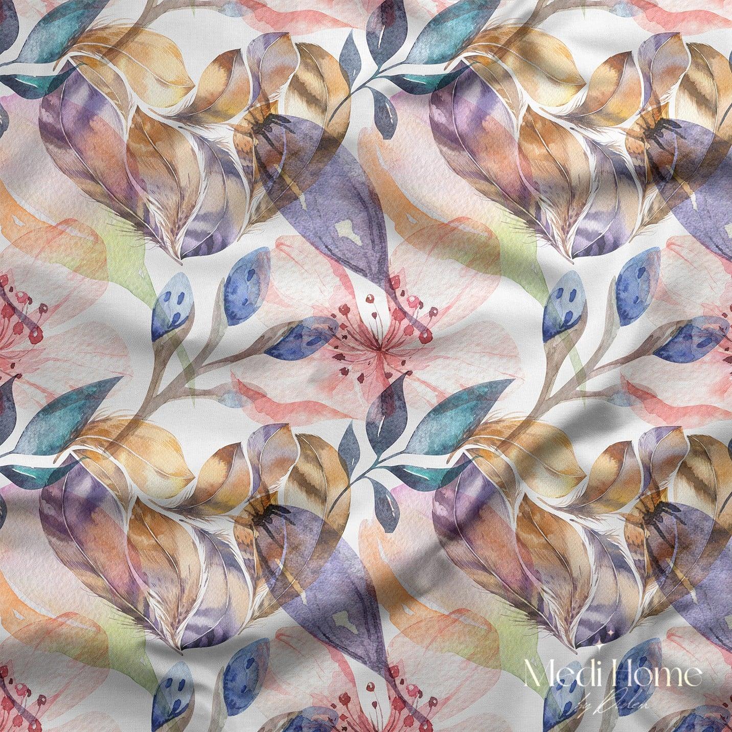 Pastel tonların şiirsel geçişleriyle sulu boya gibi akan bu desen, doğanın formlarını hayal gücüyle harmanlıyor. Yapraklar, çiçekler ve zarif dallar; pembe, lila, sarı, mavi ve turuncunun su gibi iç içe geçtiği bir uyumla dans ediyor.