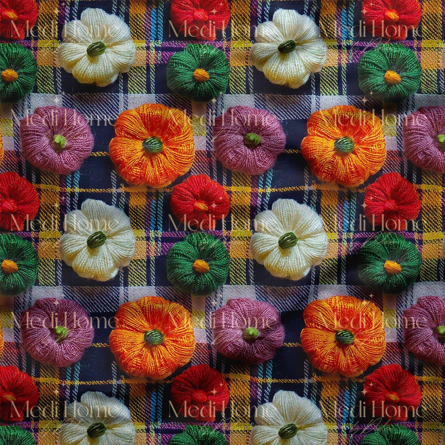 Renkli Balkabaklarıyla Sonbahar Ekosesi Dijital Baskılı Kumaş (Embroidered Pumpkins Plaids-24)