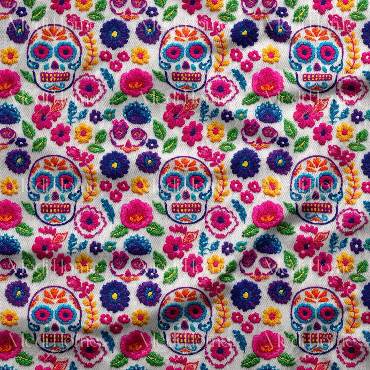 Meksika’nın ünlü “Día de los Muertos” (Ölüler Günü) ruhunu evinize taşıyan bu nakış efektli 3 boyutlu tasarım; parlak fuşya, turuncu, mavi, mor ve yeşilin enerjisini beyaz zeminle buluşturuyor. Rengârenk çiçekler ve sevimli şeker kafatasları, kumaşa eğlenceli ve canlı bir atmosfer katıyor.