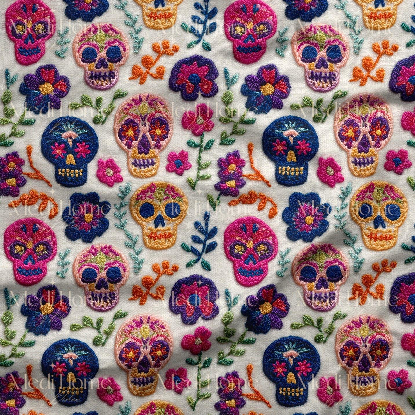 Renkli Çiçeklerle Şeker Kafatasları Dijital Baskılı Kumaş (Skulls-5)