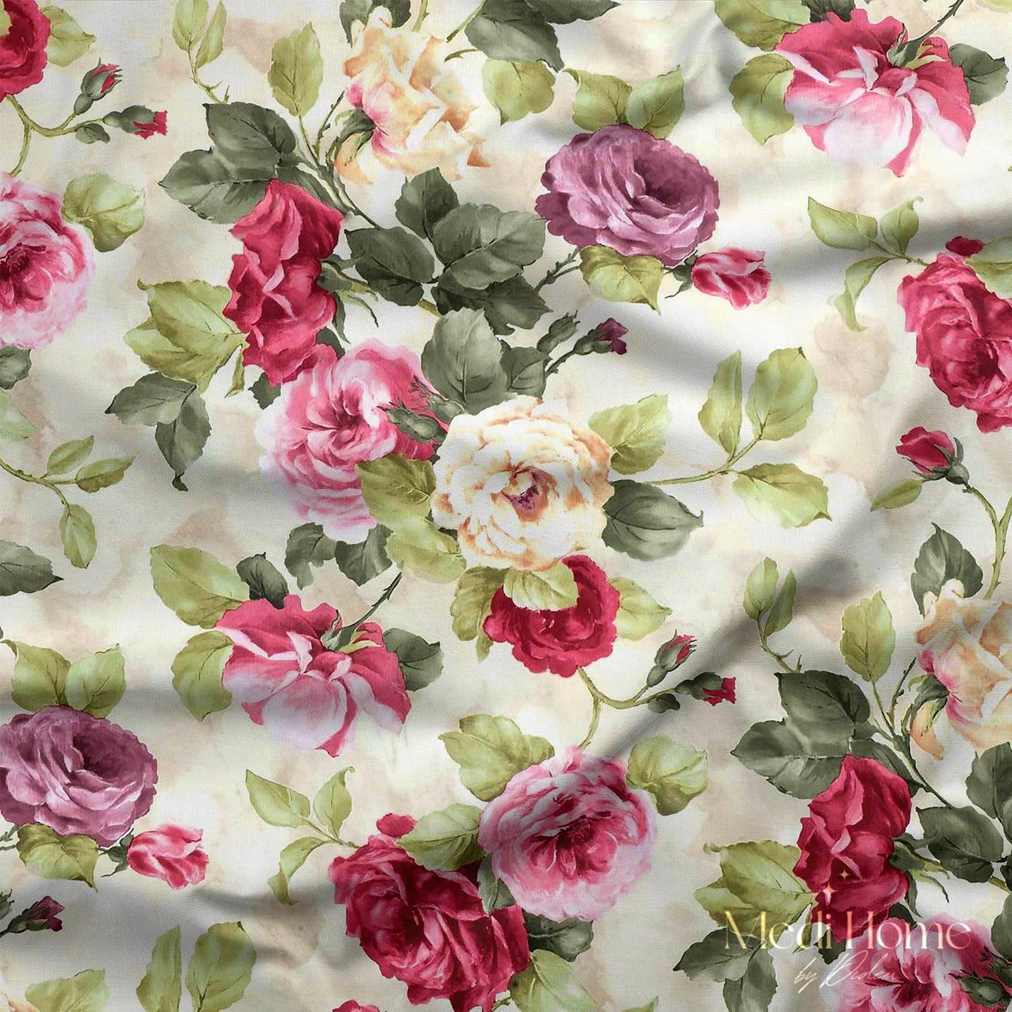 Bu desen, adeta sabah çiyleriyle uyanmış bir gül bahçesini anlatıyor. Açık bej-krem zemin üzerine yerleşmiş fuşya, mürdüm, beyaz ve somon tonlarında iri ve minik güller, adeta tablo etkisi yaratıyor. Yapraklardaki yeşilin ton geçişleri ve gül yapraklarının detaylı gölgelendirmeleri, desene doğal bir derinlik katıyor. Romantik ama bir o kadar da klasik ve zarif.