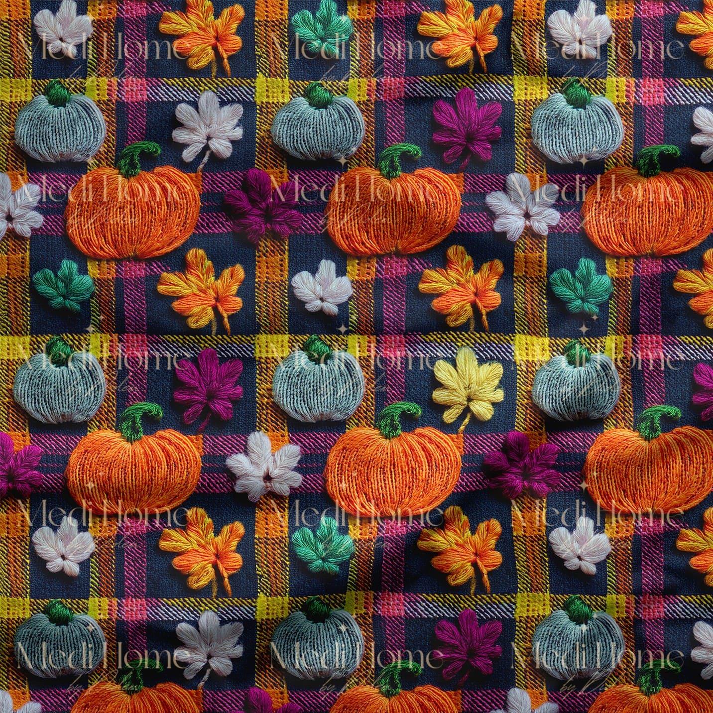 Renkli Karelerde Balkabakları ve Çiçekler Dijital Baskılı Kumaş (Embroidered Pumpkins Plaids-07)