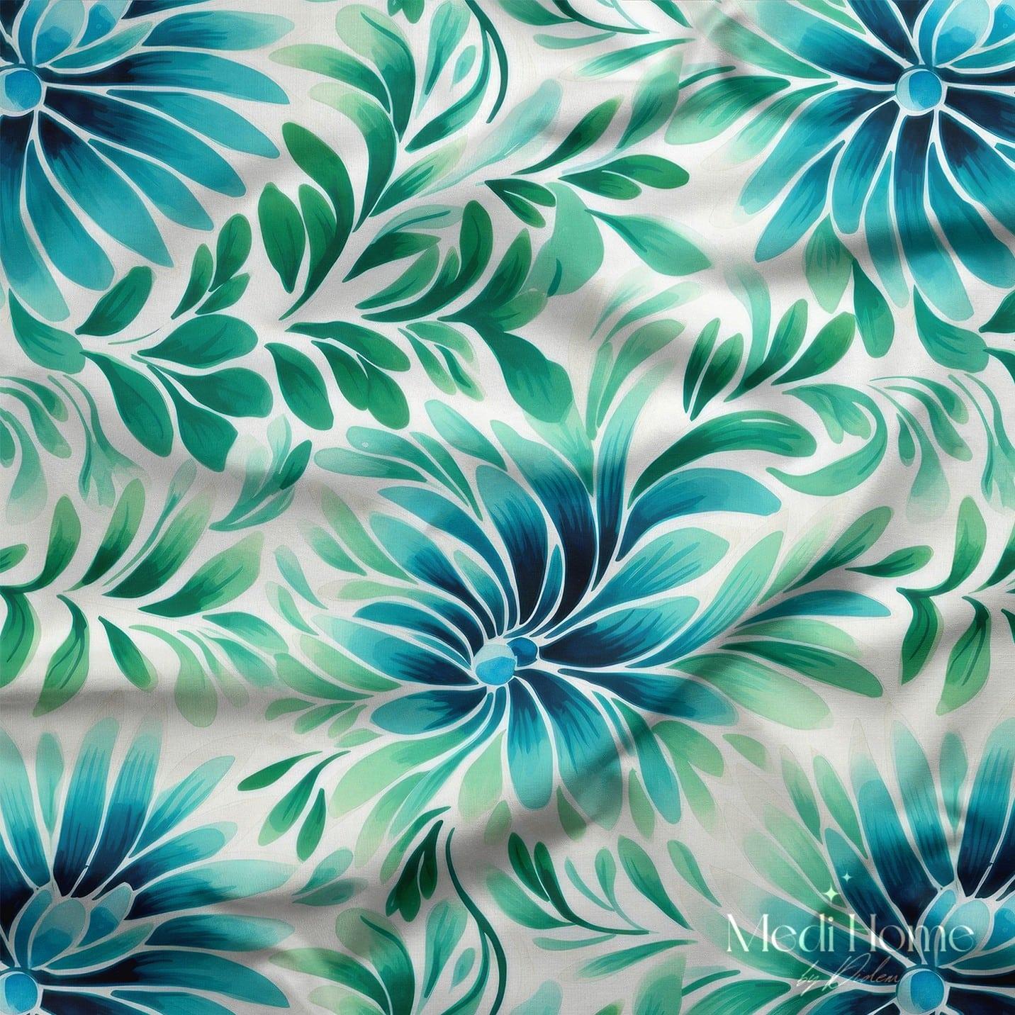 Beyaz bir tuvalin üzerine serbest fırça darbeleriyle işlenmiş mavi ve yeşil yapraklar, aralarına çiçeksi dokunuşlar da ekleyerek doğanın serinletici etkisini adeta kumaşa taşıyor. Modern suluboya hissi veren bu desen, ilkbahar tazeliğini mekânlarınıza getirmek isteyenler için biçilmiş kaftan!