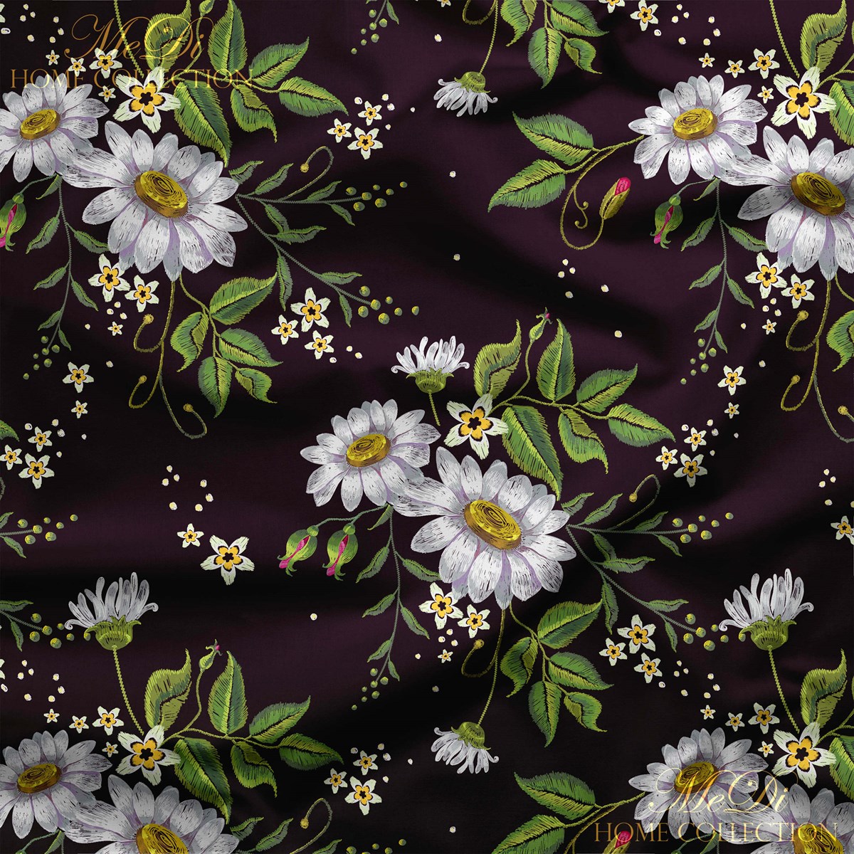 Nakış efektiyle işlenmiş gibi duran beyaz papatyalar, siyah bir gece fonunun üzerine yayılmış sanki. Yaprakların zarafeti, minik sarı çiçeklerin hareketi ve desenin her noktasına ince ince serpilmiş detaylar bu kumaşı bir sanata dönüştürüyor.