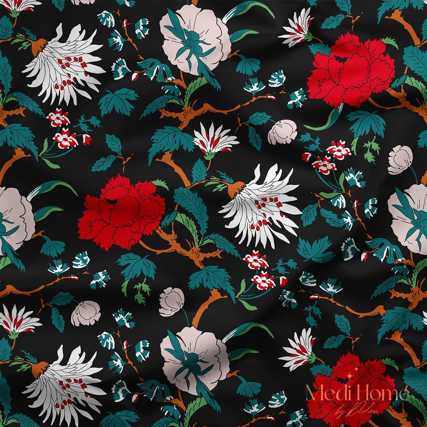 Siyah fonun üzerinde cesurca öne çıkan kırmızı, beyaz ve turkuaz tonlarındaki çiçekler, bu desene dramatik bir ihtişam kazandırıyor. Geleneksel çiçek formlarının modern yorumuyla hazırlanmış bu desen, evinizde sanatsal ve etkileyici bir atmosfer yaratacak.