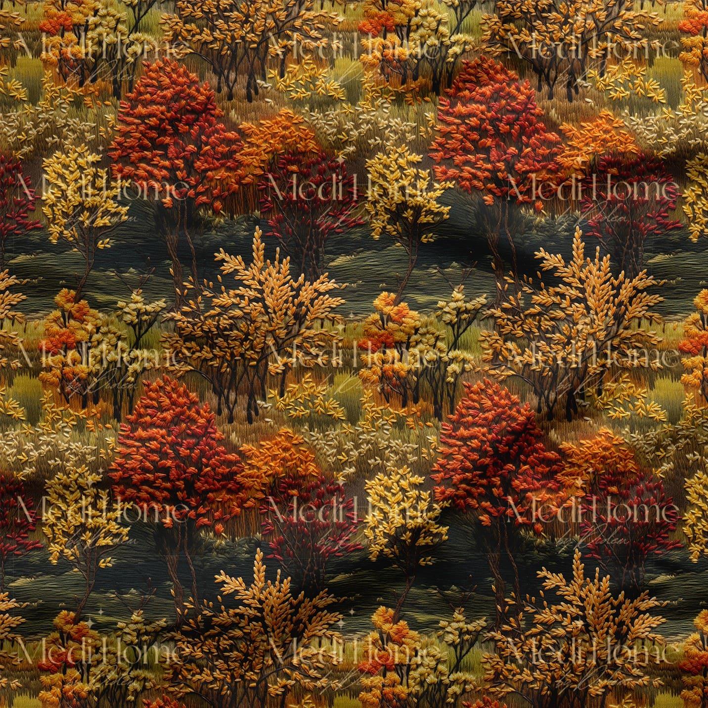 Kızıl, turuncu, sarı ve altın tonlarının ahenkle dans ettiği bu büyüleyici orman manzarası, 3 boyutlu nakış efektli dokusuyla göz kamaştırıyor. Dalları alev alev parlayan ağaçlar ve derin yeşillerin kontrastı, mevsimin sıcaklığını ve huzurunu kumaşınıza taşıyor.