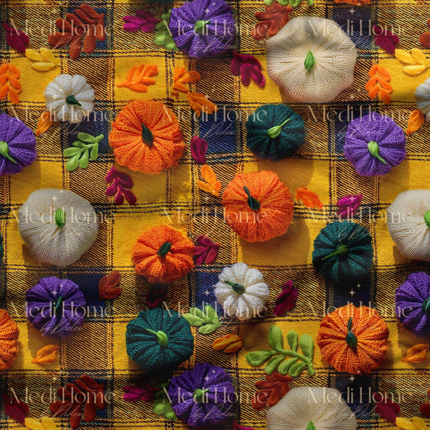 Sonbahar Podyumunda Balkabakları Dijital Baskılı Kumaş (Embroidered Pumpkins Plaids-12)