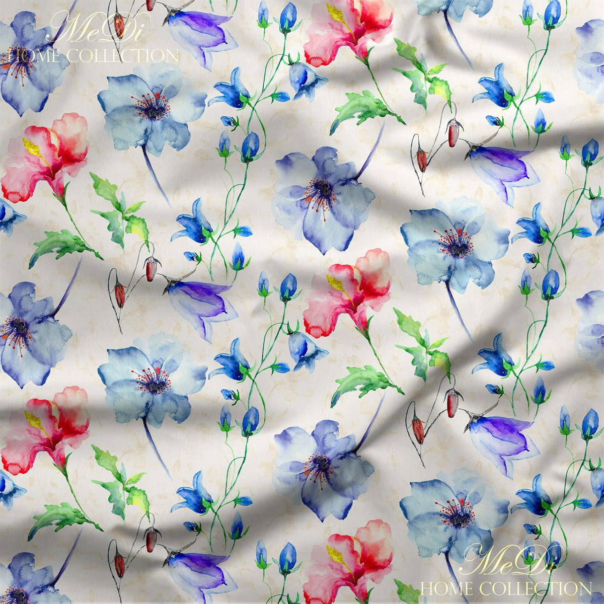 Krem tonlu huzurlu bir fon üzerinde, suluboya fırçasının zarif dokunuşlarıyla hayat bulan mavi, kırmızı ve mor çiçekler. İnce yeşil dallar ve tomurcuklar arasında adeta baharın hafif esintisini taşıyan bu desen, romantik ve ferah bir atmosfer yaratıyor.