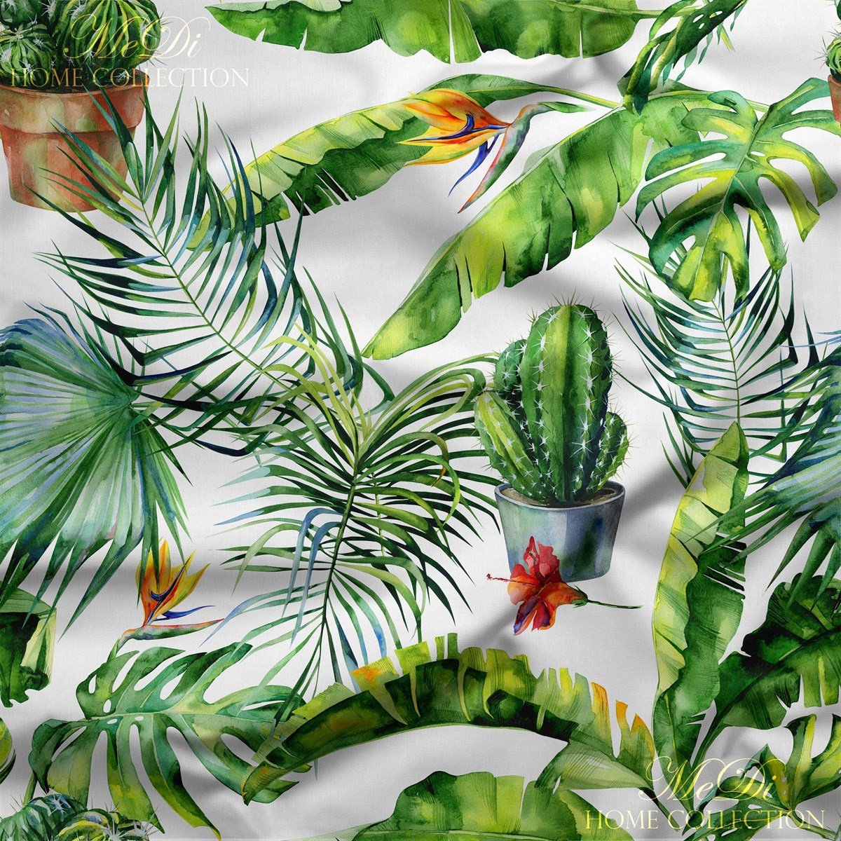 Doğanın en serin, en vahşi hali bu kumaşta hayat buluyor! Kaktüs saksıları, tropikal dev yapraklar, kuş cenneti çiçekleri. Rengârenk bir ormanın ortasında, sanki egzotik bir bahçede nefes alıyorsun.