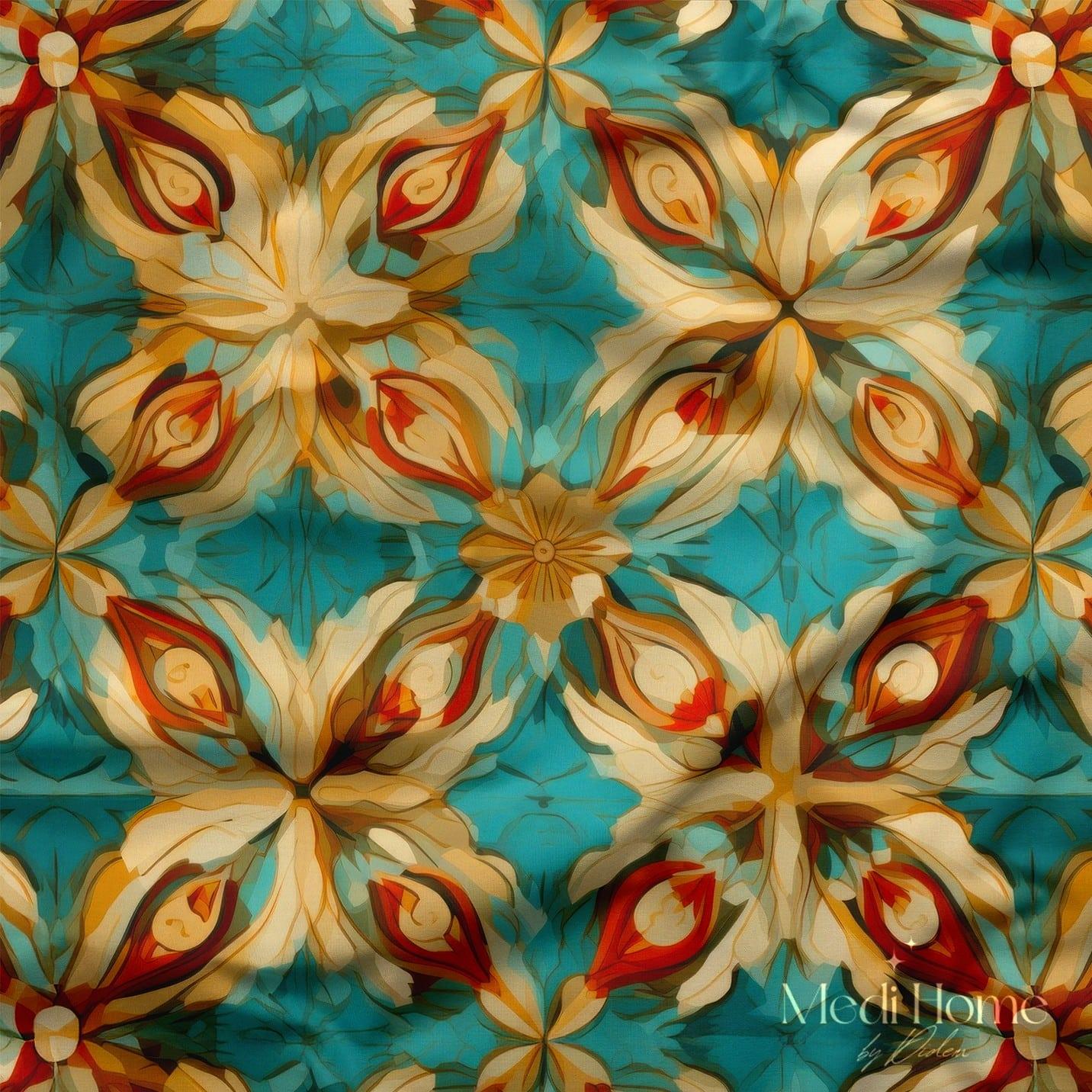 Turkuazın huzur veren derinliği, altın tonlarının sıcaklığı ve lale formunun zamansız zarafeti. Bu desen, adeta suyun yüzeyine yansıyan çiçeklerin, güneşin ışığıyla dans ettiği bir tablo gibi. Simetrik yerleşim, mekânlara düzenli, estetik ve çarpıcı bir görünüm kazandırır.