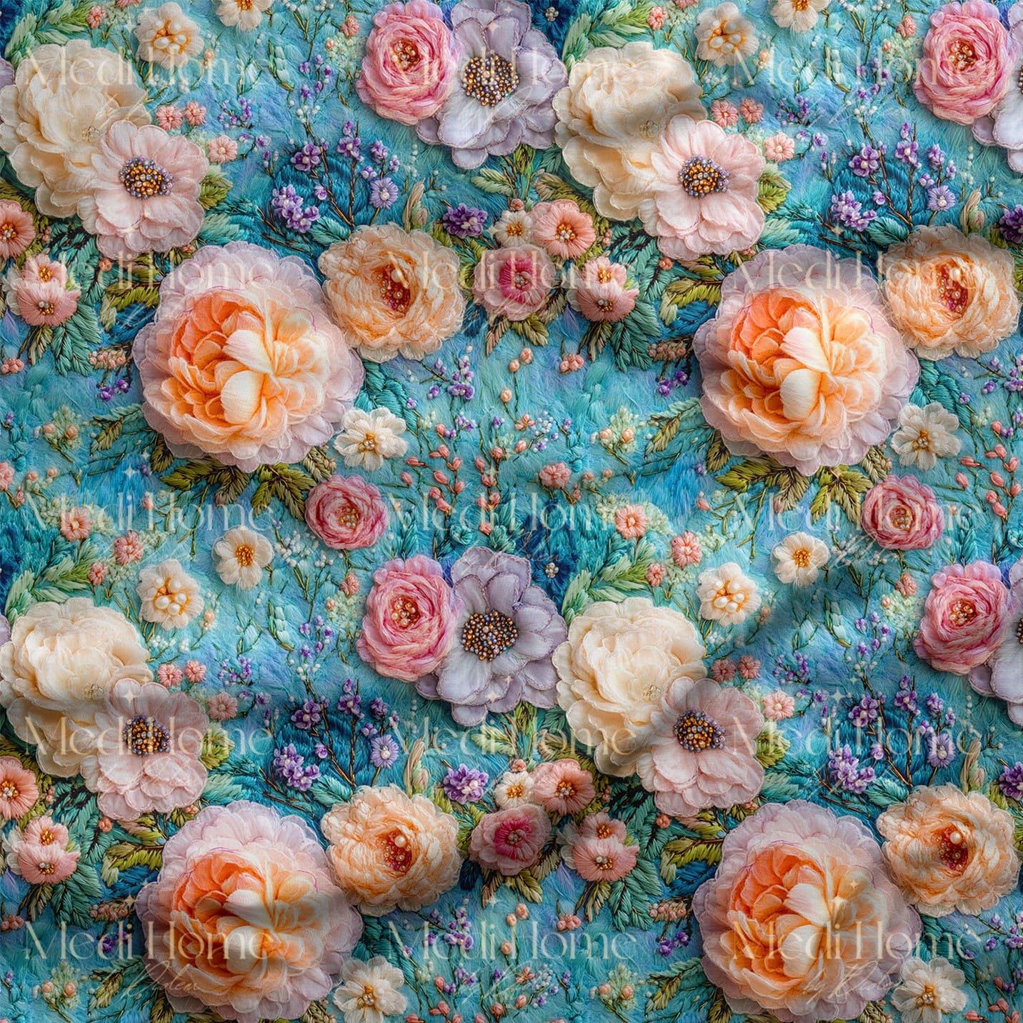 Parlak turkuaz zemin üzerinde mercan, şeftali ve yumuşak pembe tonlarında çiçeklerin masalsı buluşması. 3 boyutlu nakış efektli detaylar ve inci dokunuşları, adeta el işçiliği hissi uyandıran görkemli bir bahçe atmosferi yaratıyor.