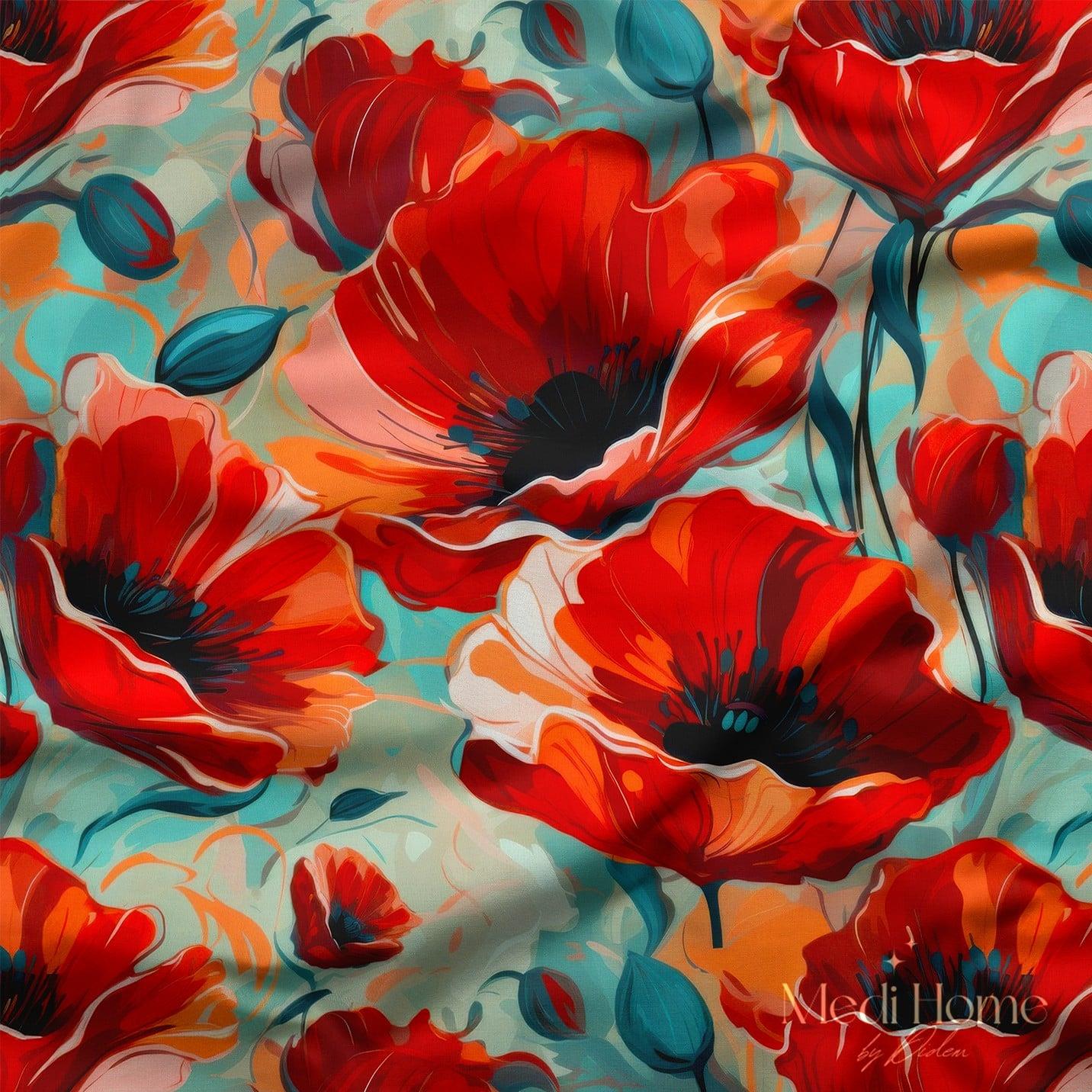 Canlı turkuaz zemin üzerine yerleşmiş, ateş kırmızısının en tutkulu tonlarındaki gelincikler. Aralarında turuncu dokunuşlar, koyu yeşil yapraklar ve su gibi akıp giden fırça darbeleri… Bu tasarım, doğanın en enerjik ve romantik yüzünü evinize taşıyor.
