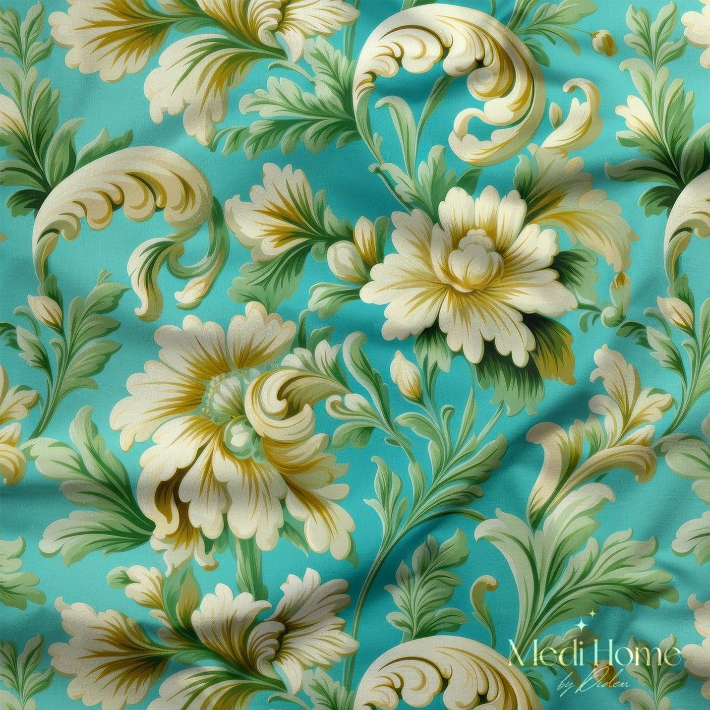 Turkuazda Altın Barok Bahar Dijital Baskılı Kumaş (MB-0213)