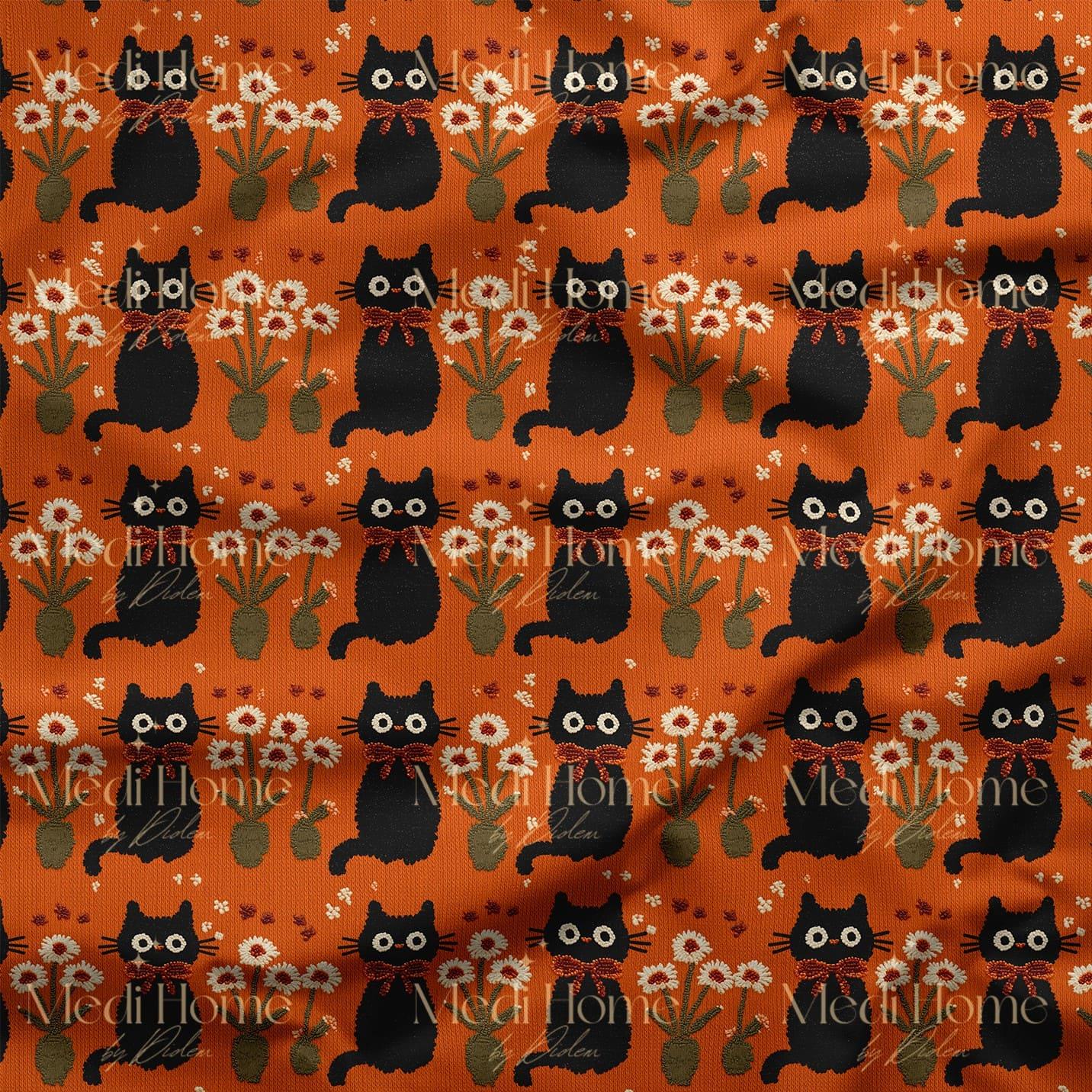 Canlı turuncu zemin üzerinde zarif çiçek vazoları ve kırmızı kurdeleli siyah kediler, 3 boyutlu nakış efektiyle adeta kumaşın üzerine işlenmiş gibi görünüyor. Çarpıcı turuncu ve derin siyah tonlarının kontrastı, dekorlarınıza hem neşeli hem de sofistike bir hava katıyor.