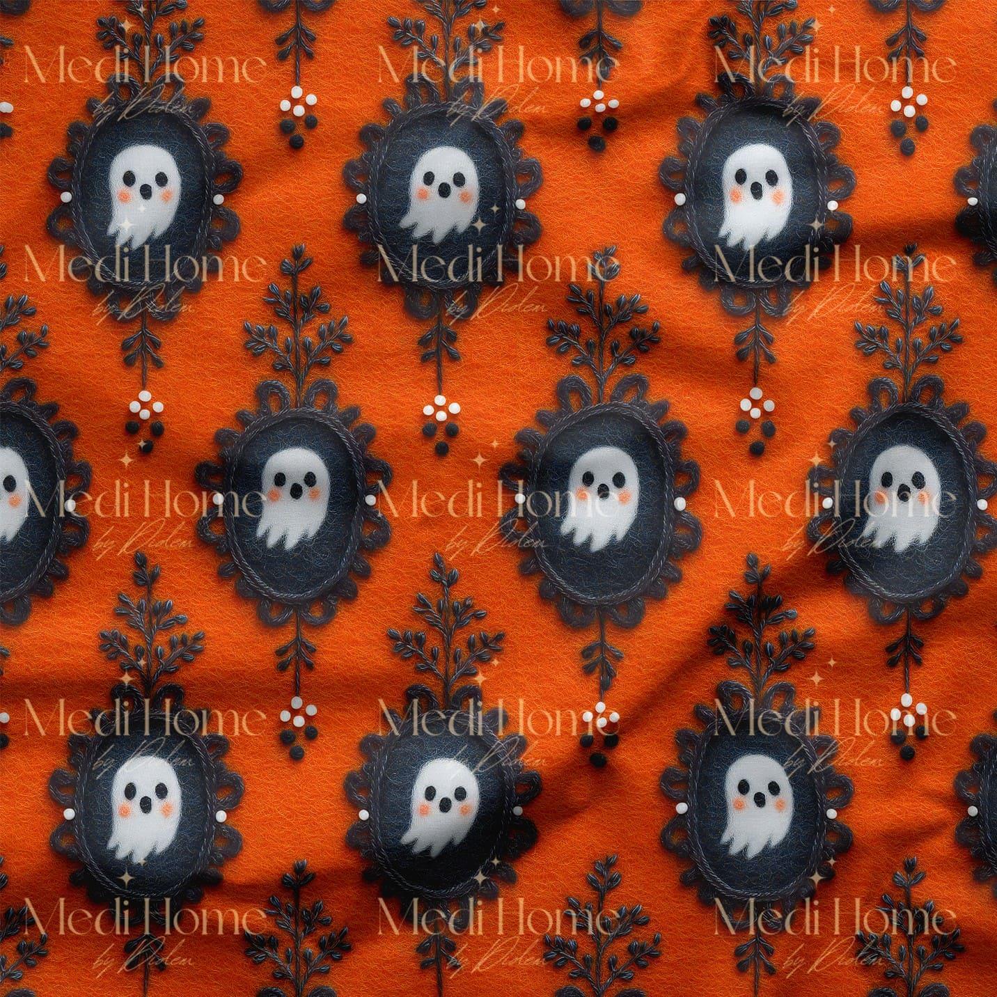 Canlı turuncu zemin üzerinde siyah dantel çerçevelerle çevrelenmiş sevimli beyaz hayaletler, 3 boyutlu nakış efektli dokusuyla tasarıma hem eğlenceli hem de sofistike bir hava katıyor. Siyah ve beyazın kontrastı, turuncunun enerjisiyle birleşerek güçlü ve göz alıcı bir görünüm sunuyor.